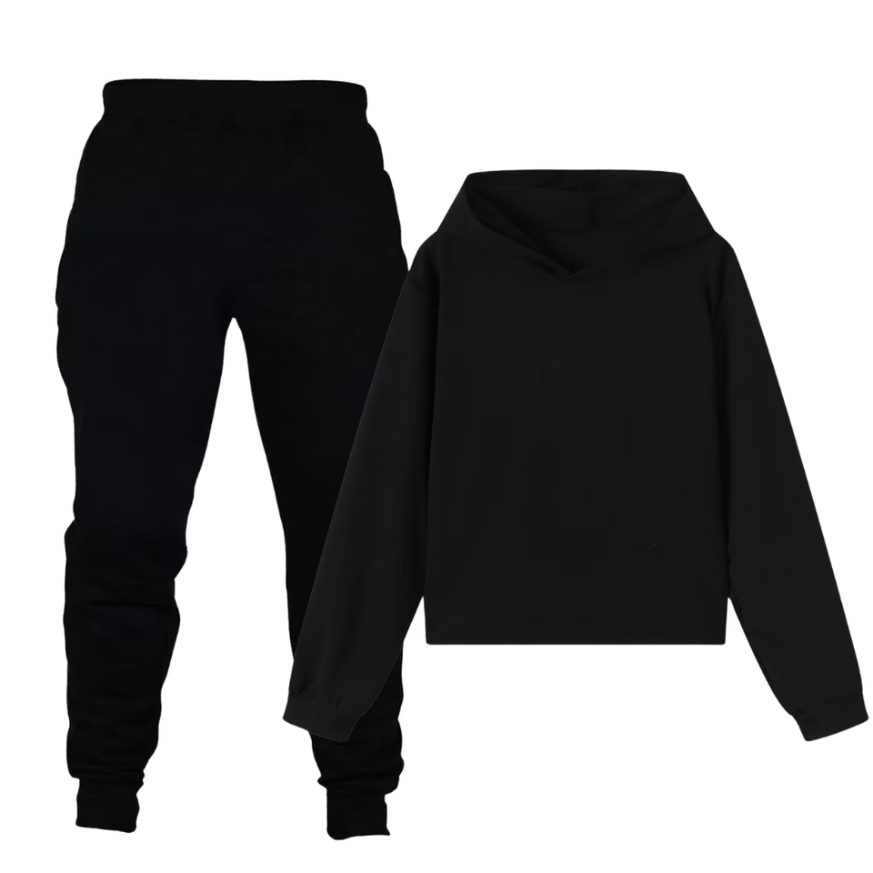 ชุดฮู้ดดี้สีดำและกางเกงจ็อกเกอร์สำหรับผู้หญิง สไตล์ลำลองสำหรับฤดูหนาว ชุดสองชิ้น สวมใส่สบาย เหมาะสำหรับพักผ่อน ขายส่งแบบ OEM