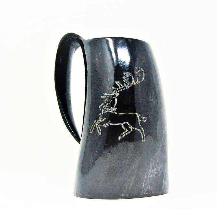 แก้วเบียร์ทรงกระบอกสีดำ ลายกวางสลักอย่างประณีต พร้อมหูจับแข็งแรง ดีไซน์ทันสมัย ใช้ซ้ำได้ เหมาะสำหรับงานปาร์ตี้