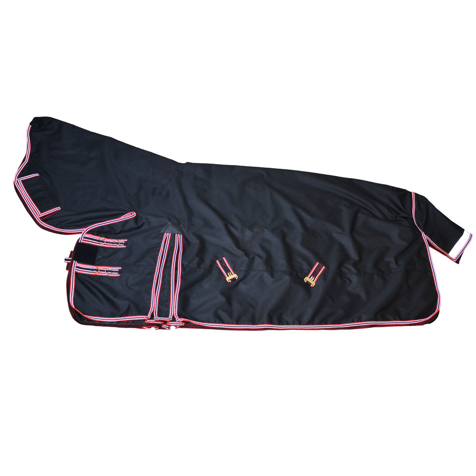 ผ้าคลุมม้าสีดำแบบเต็มตัว ขอบสีแดงขาว กันน้ำ ระบายอากาศได้ดี ผ้าห่มสำหรับกลางแจ้ง สายรัดปรับได้ ทนทานด้วยสแตนเลส
