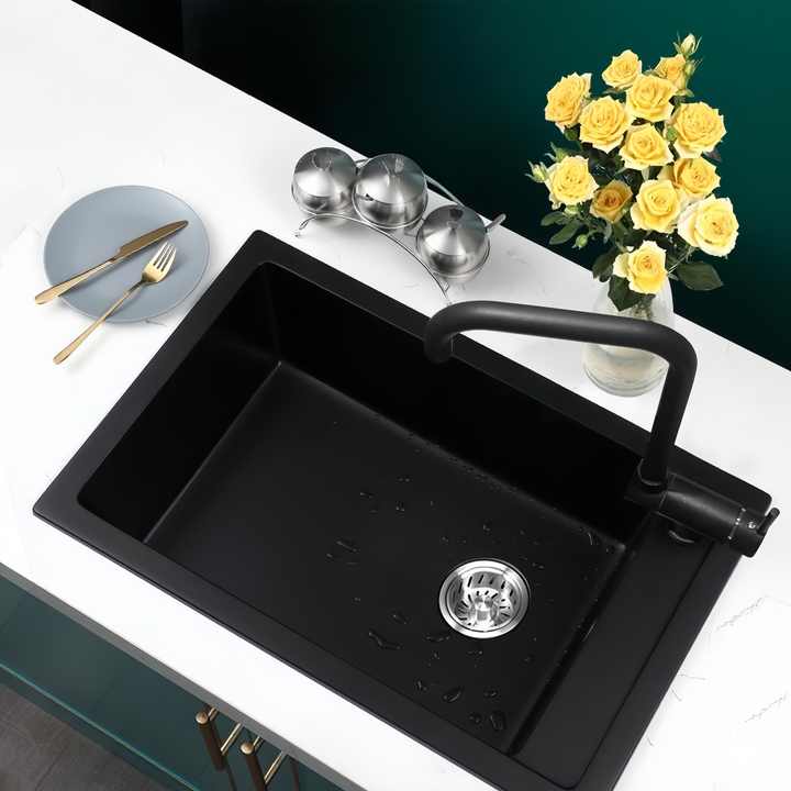 อ่างล้างจานหินควอตซ์สีดำแบบอ่างเดี่ยวสำหรับล้างผักและล้างจานพร้อมก๊อกน้ำด้านข้าง