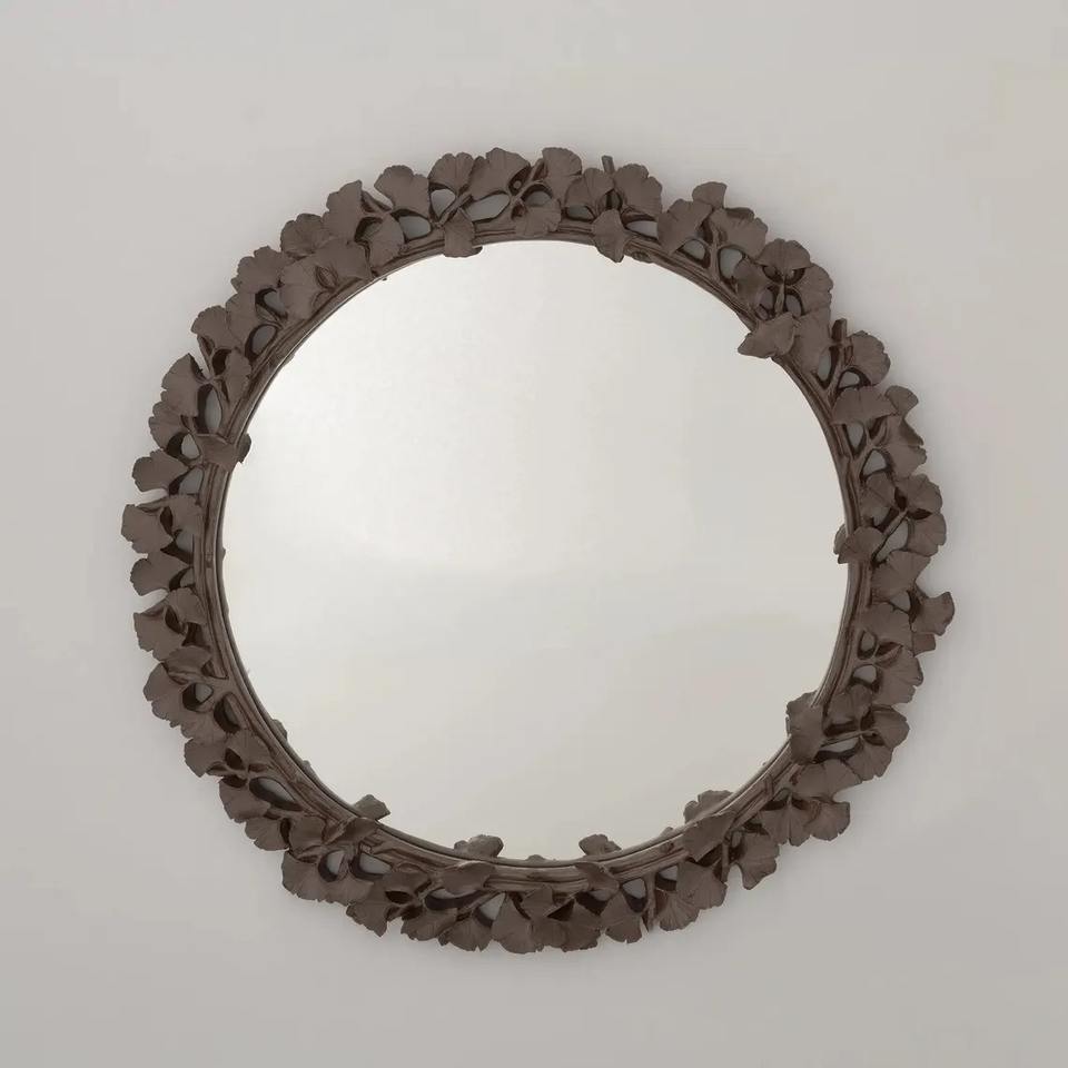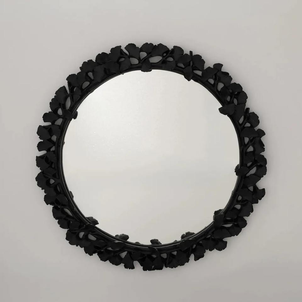 กระจกทรงใบไม้สีดำ ดีไซน์ขอบโค้งมน เหมาะสำหรับตกแต่งผนังห้องนั่งเล่น ให้ลุคหรูหราแบบธรรมชาติจากอินเดีย