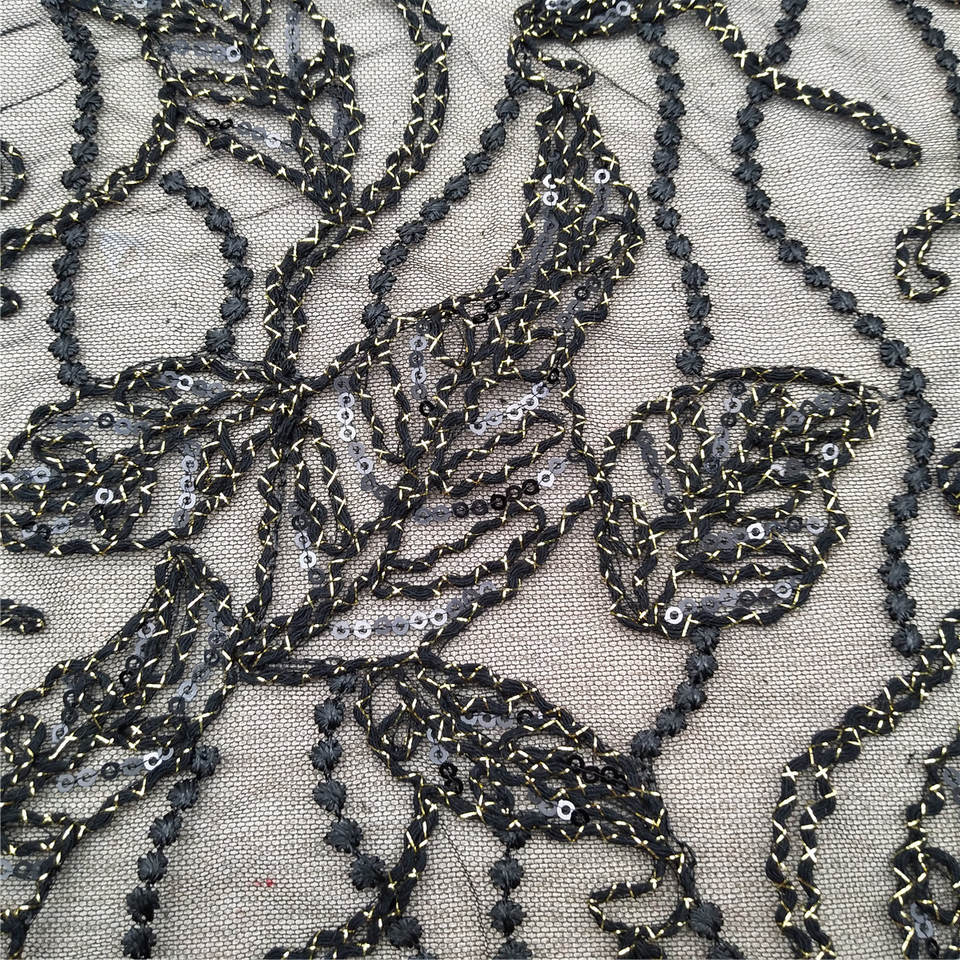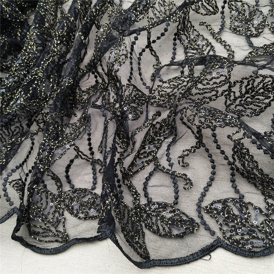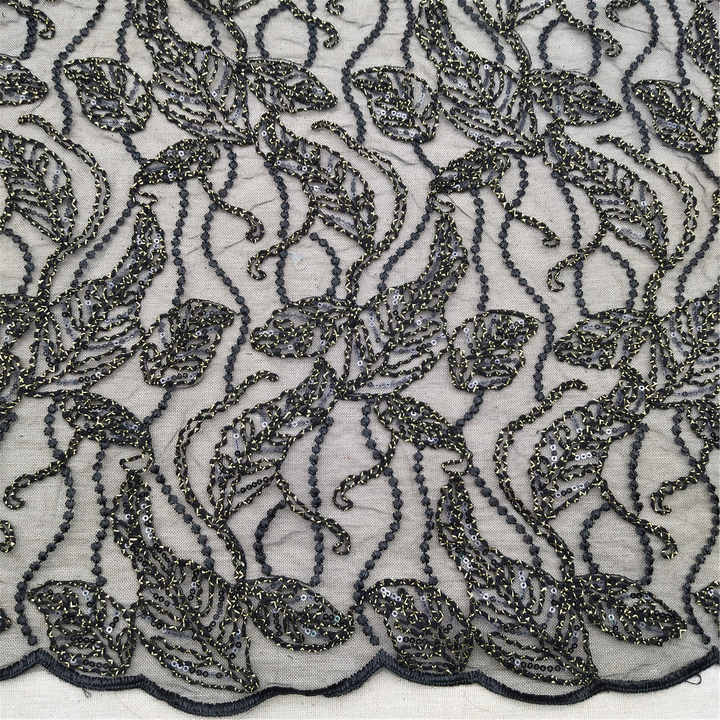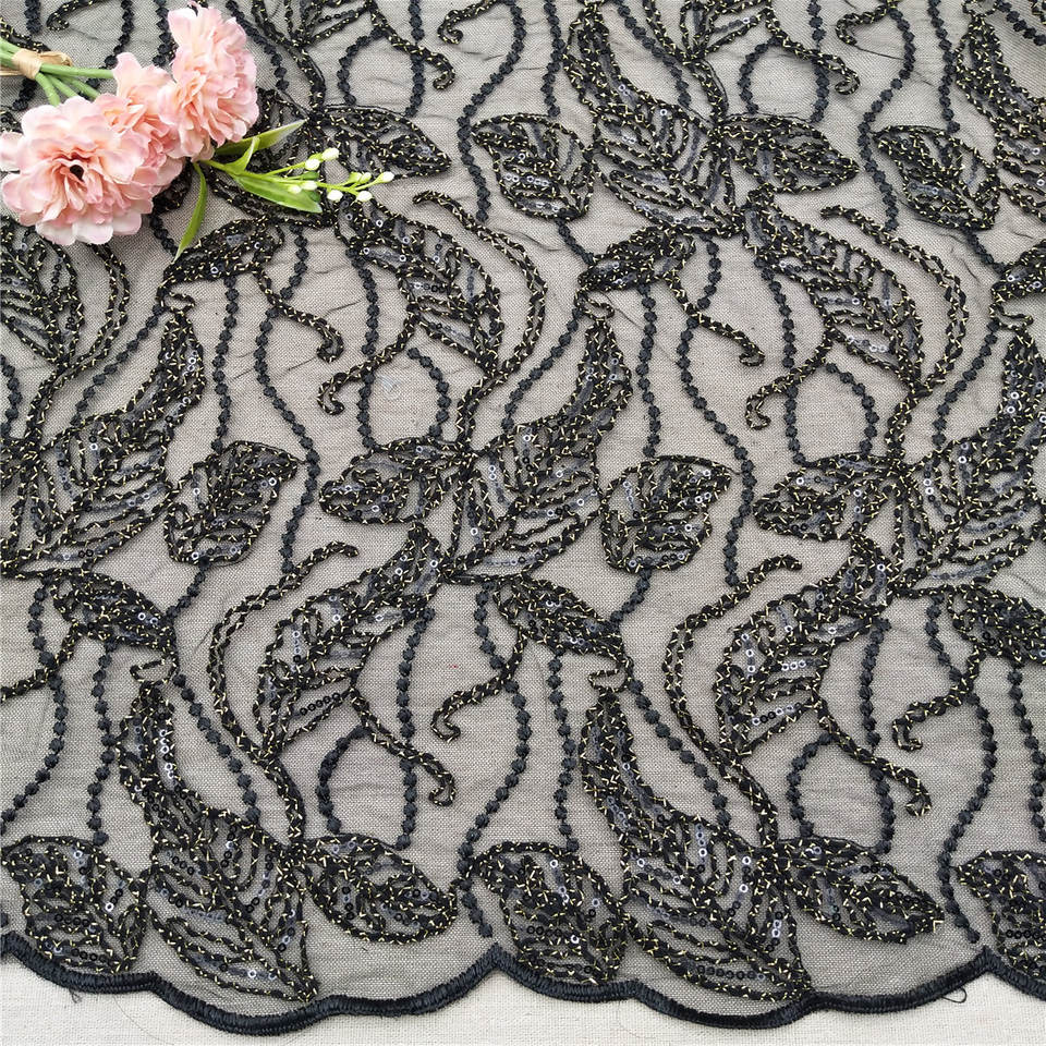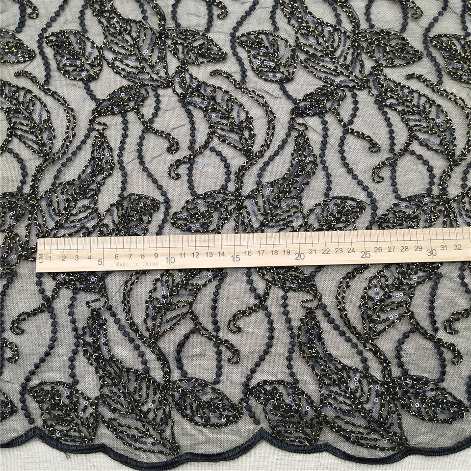 ผ้าลูกไม้ตาข่ายปักลายดอกไม้สไตล์ใบไม้สีดำ + ประดับเลื่อม สำหรับเสื้อผ้า ชุดเดรส ของตกแต่งบ้าน งานแต่งงานสุดเซ็กซี่