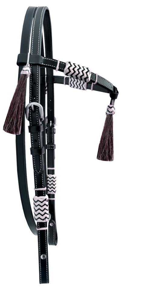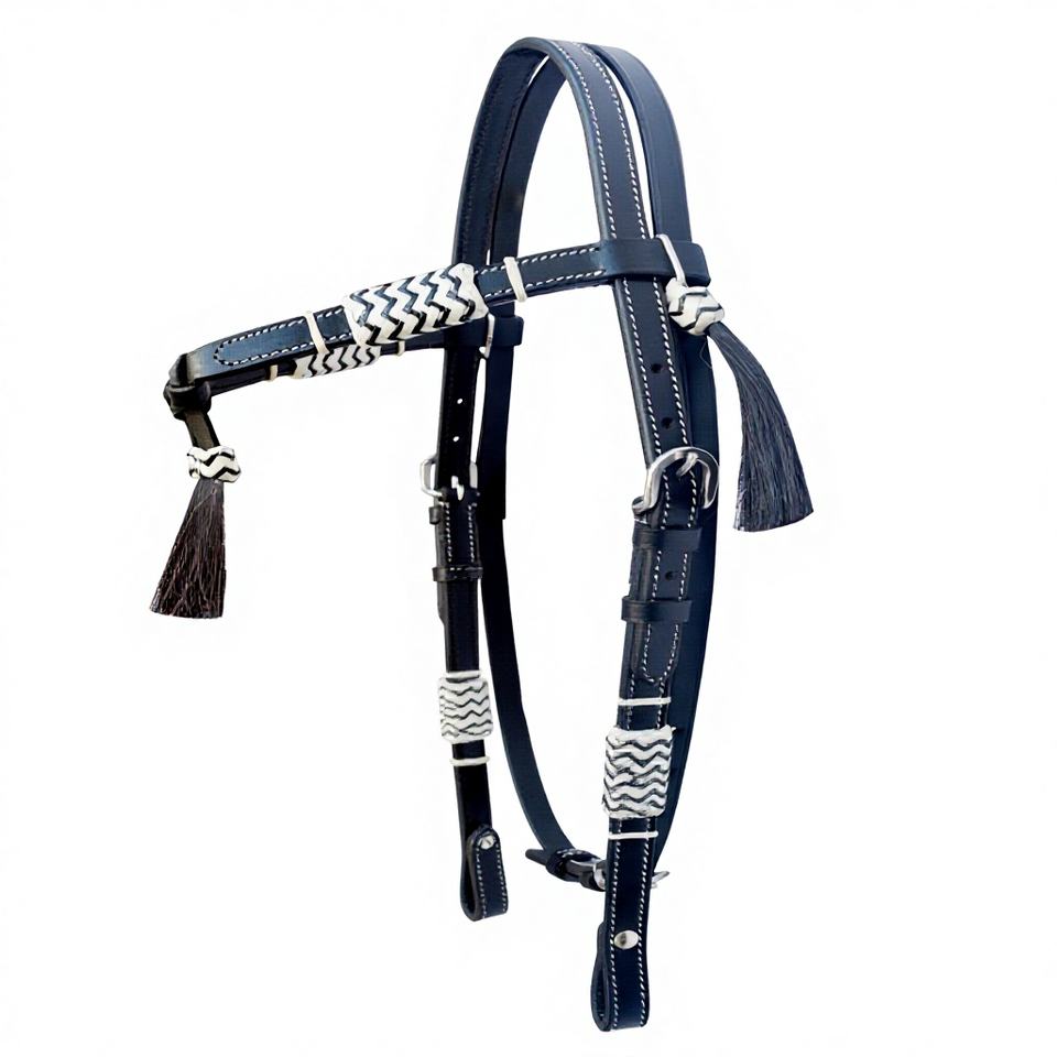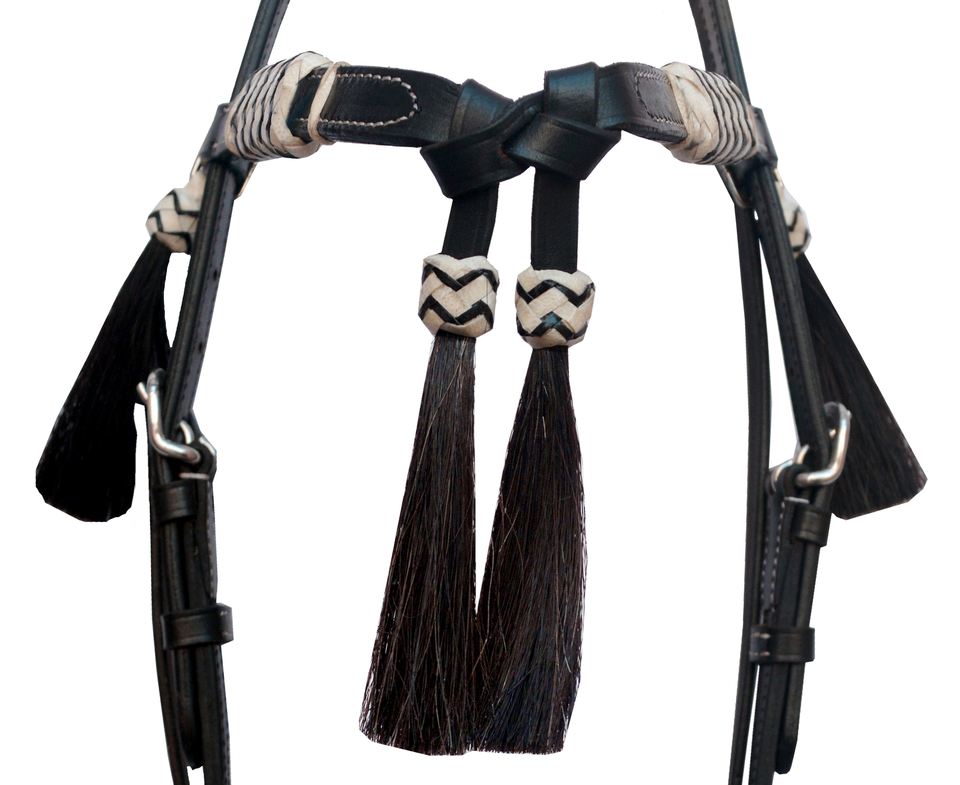 บังเหียนม้าหนังสีดำ สายรัดศีรษะทำจากหนังดิบธรรมชาติ ถักด้วยมือ ปรับได้ พร้อมปมแบบ Futurity และพู่หนัง จำนวน 25 ชิ้น รุ่น 513