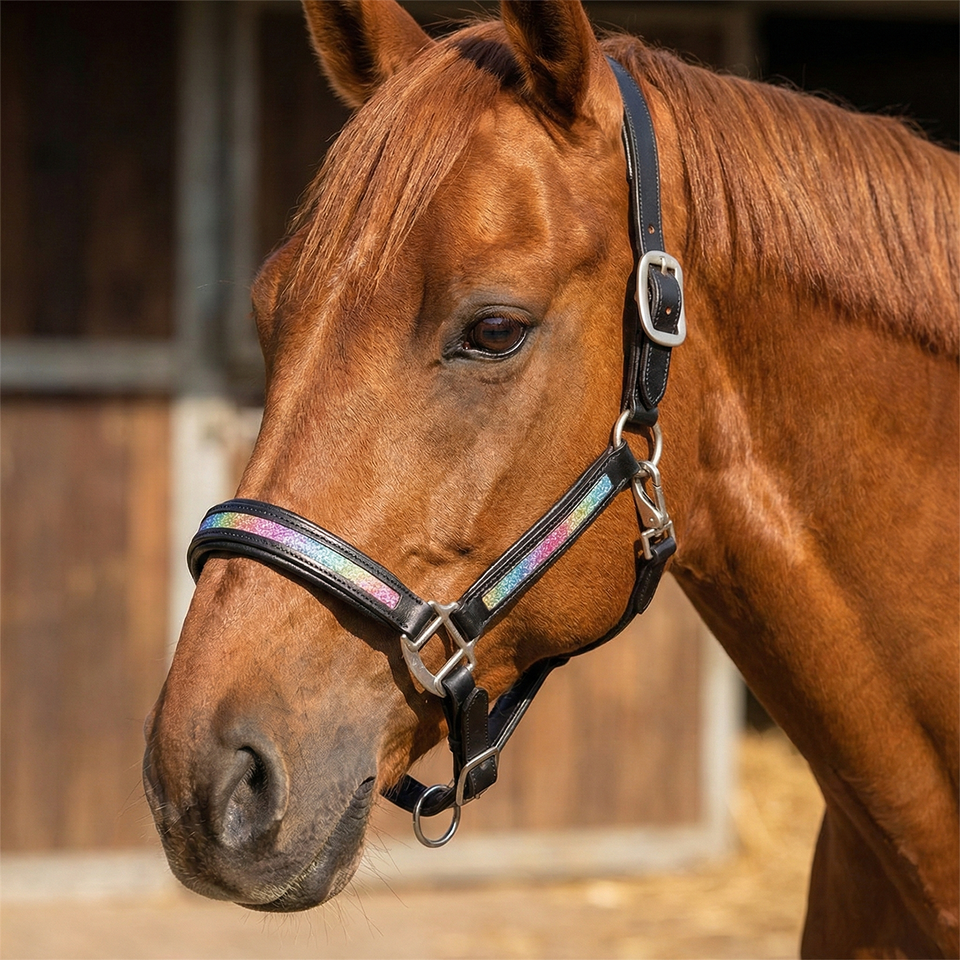 Black Leather English Saddle Rainbow Glitter Noseband Cheekpieces Adjustable Silver Hardware Customizable High Quality Stylish