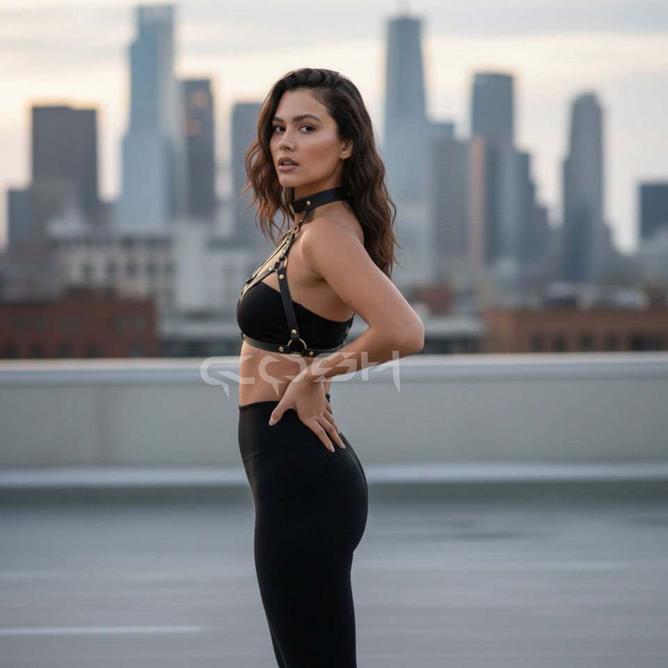 ชุดรัดตัวหนังสีดำแบบหลายสายพร้อมรายละเอียดห่วงโอริงแบบโบราณ