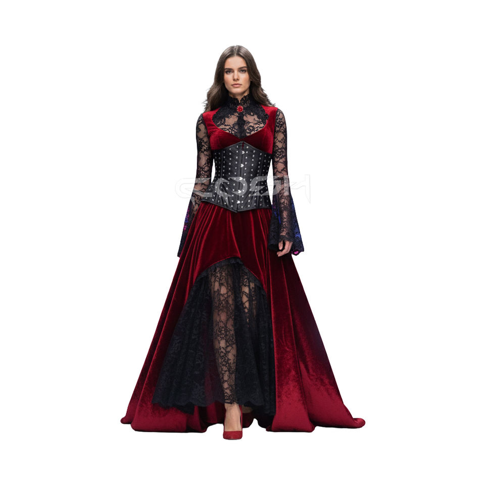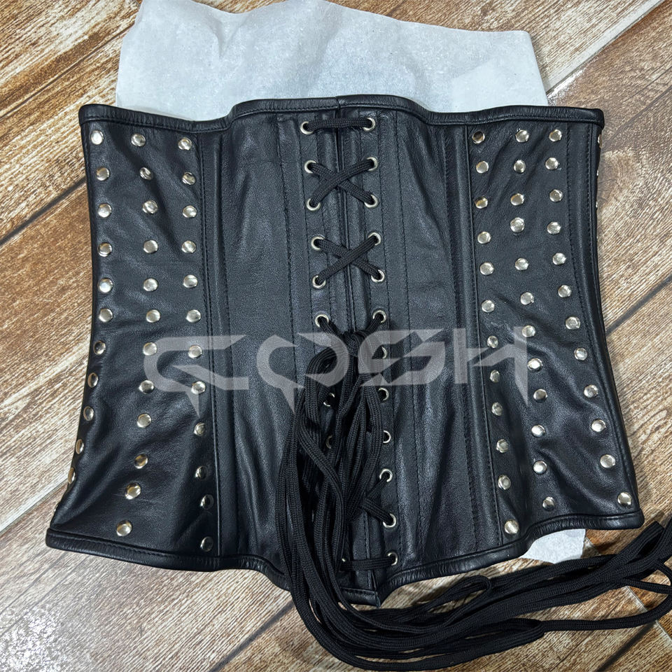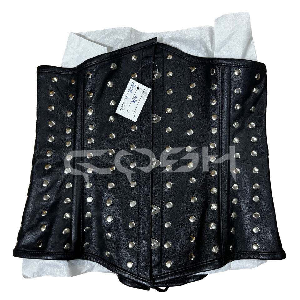 คอร์เซ็ทหนังสีดำเสริมโครงเหล็กแบบรัดใต้อกสำหรับฮาโลวีน ดีไซน์ประดับหมุดทั่วตัว