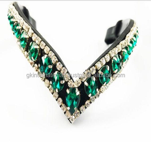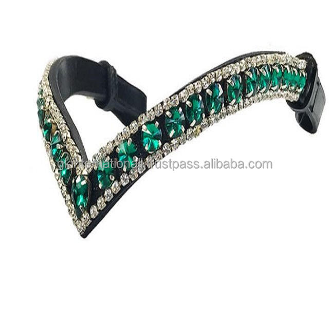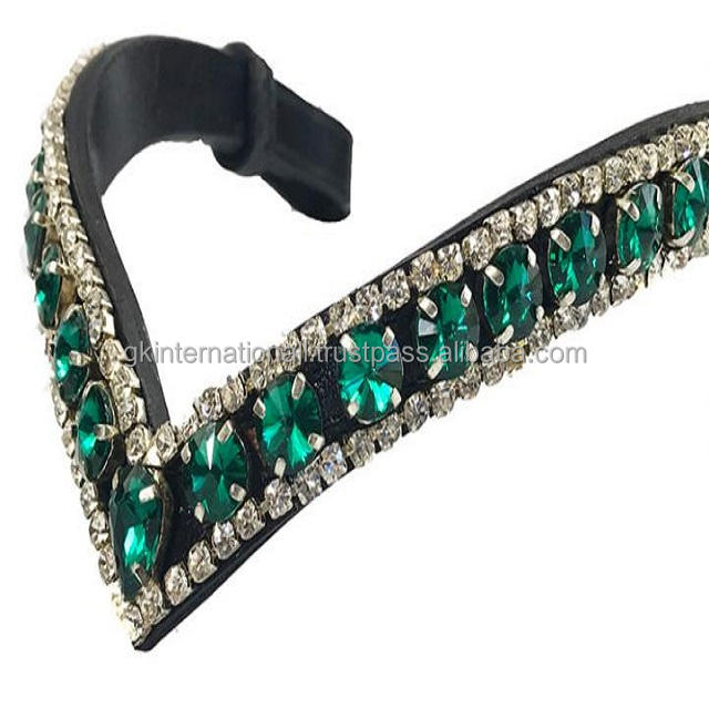 สายคาดหน้าผากม้าหนังสีดำรูปตัววี ประดับด้วยโซ่โลหะคริสตัลขนาดใหญ่สีเงินและสีเขียวสามแถว พร้อมกระดุมแบบปลดเร็วสำหรับห่วง