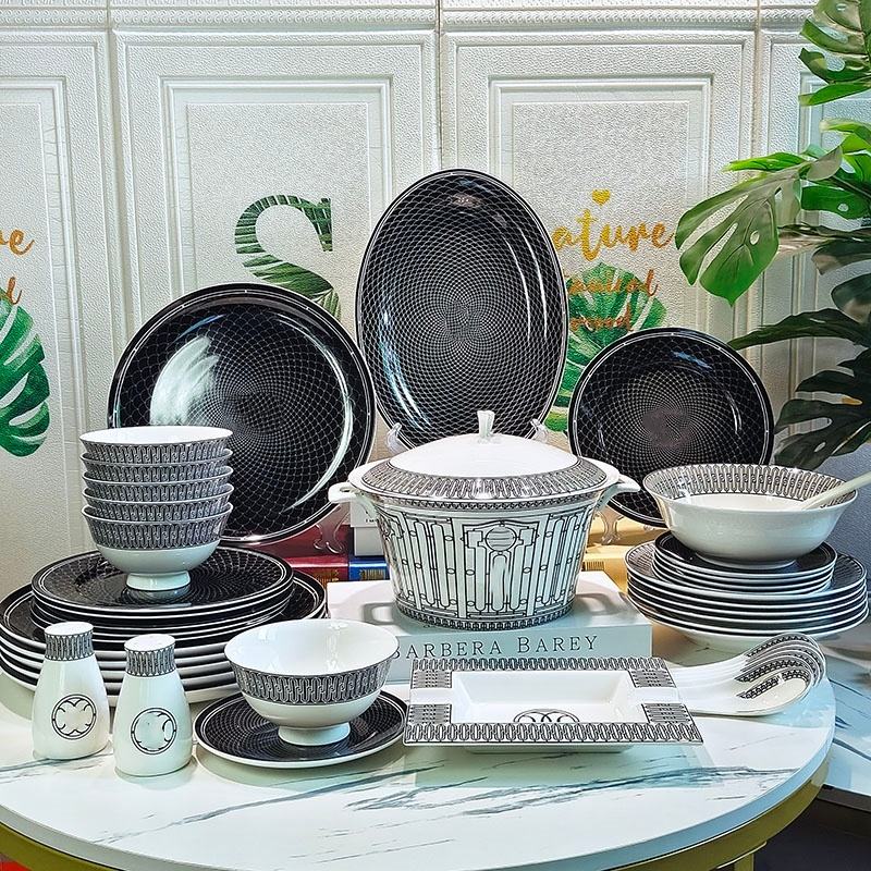 ชุดเครื่องครัวลายเส้นดำ ชุดชามและจาน ชุดอาหารค่ำพอร์ซเลน ชุดแก้วมินิมอล ชุดเซรามิกสไตล์ตะวันตก โบนไชน่า