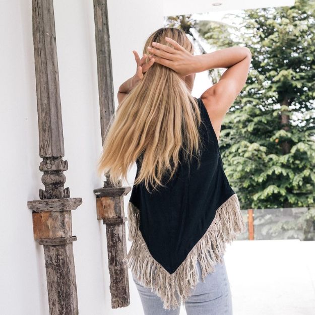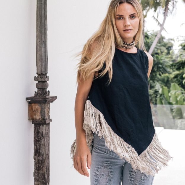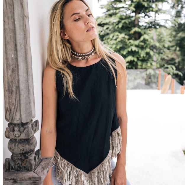 เสื้อผ้าลินินสีดำสำหรับผู้หญิง เสื้อโบโฮฤดูร้อน เสื้อผ้าลินินออร์แกนิกแต่งชายครุย เสื้อลำลองสไตล์ฮิปปี้ยิปซี เสื้อแขนกุดสไตล์โบฮีเมียนสำหรับผู้หญิง