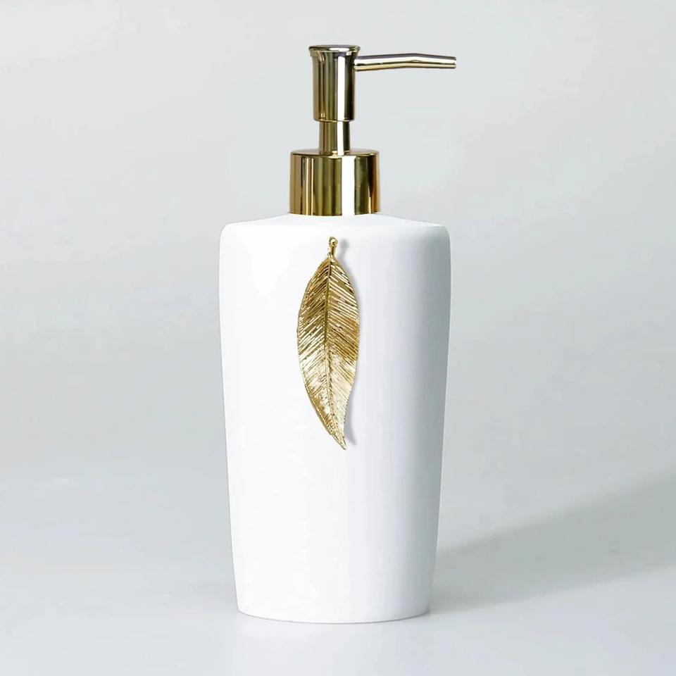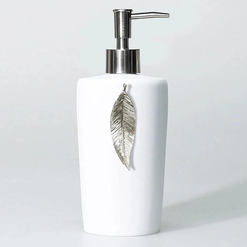 เครื่องจ่ายโลชั่นสีดำพร้อมดีไซน์เป็นรูปใบไม้ที่จัดระเบียบอย่างทันสมัยเหมาะสำหรับโต๊ะเครื่องแป้งในห้องน้ำการตกแต่งบ้านและเป็นของขวัญ