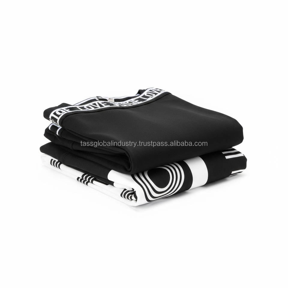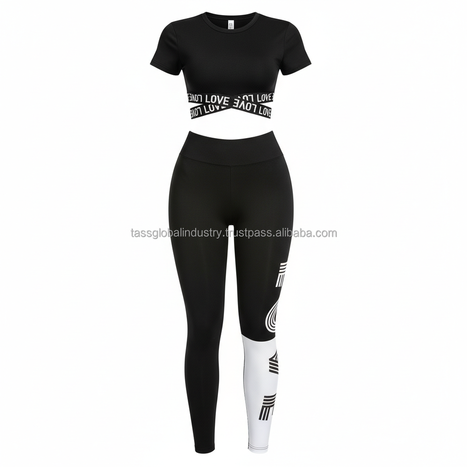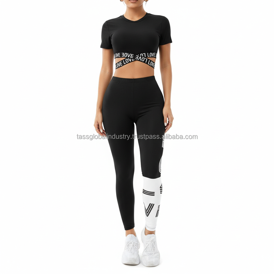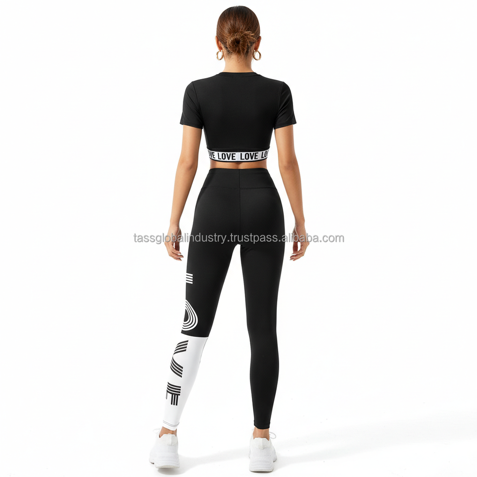 ชุดเซ็ตพิมพ์ลายจดหมายรักสีดำแบบเรียบ OEM ผลิตตามสั่ง ชุดออกกำลังกายสำหรับผู้หญิง 5 ชิ้น แบบเย็บต่อผ้า ชุดเลกกิ้งสำหรับออกกำลังกาย ฟิตเนส และเล่นกีฬา