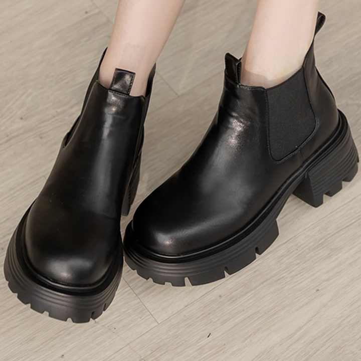รองเท้าบูทเชลซีส้นหนาพื้นยางสีดำ สไตล์ลำลองสำหรับฤดูหนาว