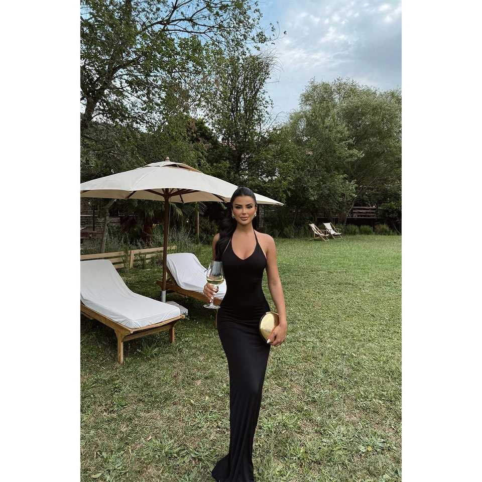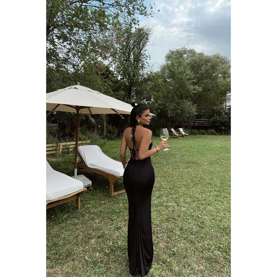 ชุดราตรีสีดำสุดหรู ไซส์ XS ทรงบอลกาวน์ สายรัดด้านหลัง ตกแต่งด้วยโครเชต์ 3 มิติ ประดับด้วยคริสตัลและเลื่อม ความยาวระดับพื้น ทรงเอไลน์