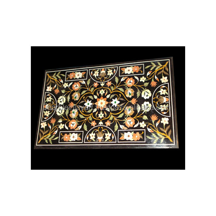 Black Marble Stone Inlay Dining Table Top With Pietra Dura Art Work