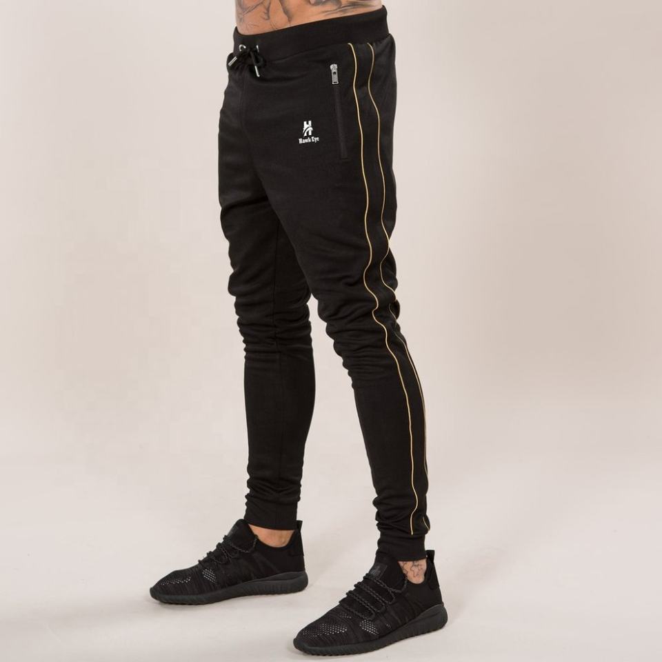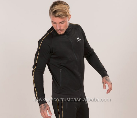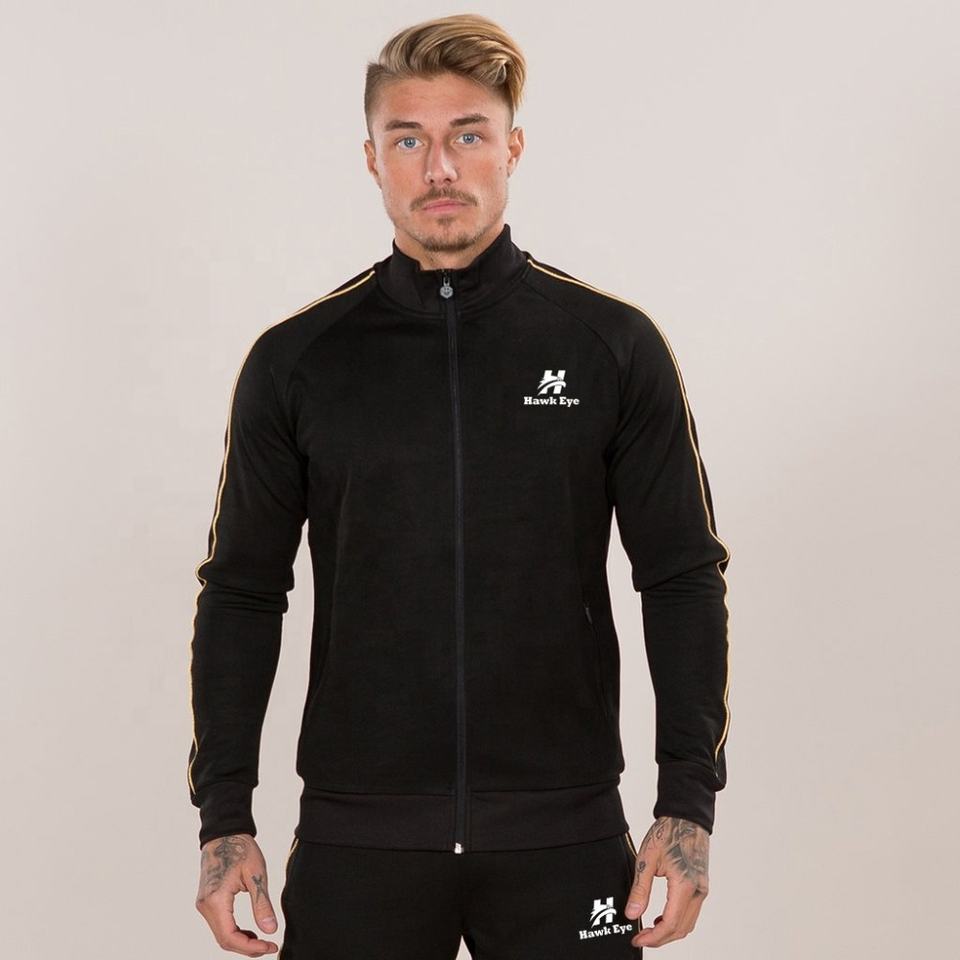 ชุดวอร์มฤดูหนาวสำหรับผู้ชายสีดำ แจ็คเก็ตและกางเกงขายาว พร้อมโลโก้แบบกำหนดเองสองเส้นสีทอง ผ้าฟลีซระบายอากาศได้ดี