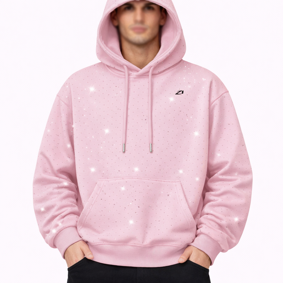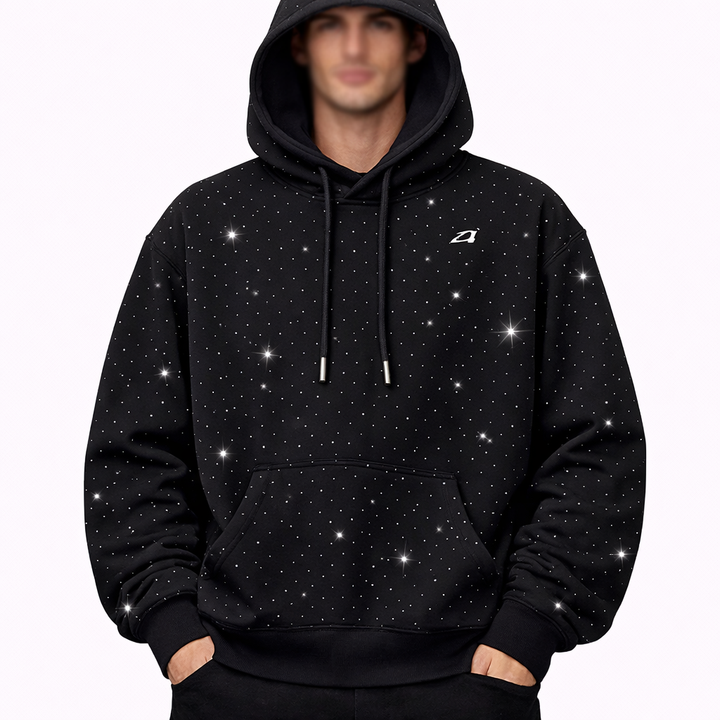 เสื้อฮู้ดดี้ผู้ชายสีดำแบบมินิมอลประดับเพชรเทียม ผ้าฝ้ายฟลีซ 400 GSM ทรงโอเวอร์ไซส์ สตรีทแวร์ มีเชือกผูก OEM รับผลิตแบรนด์ส่วนตัว