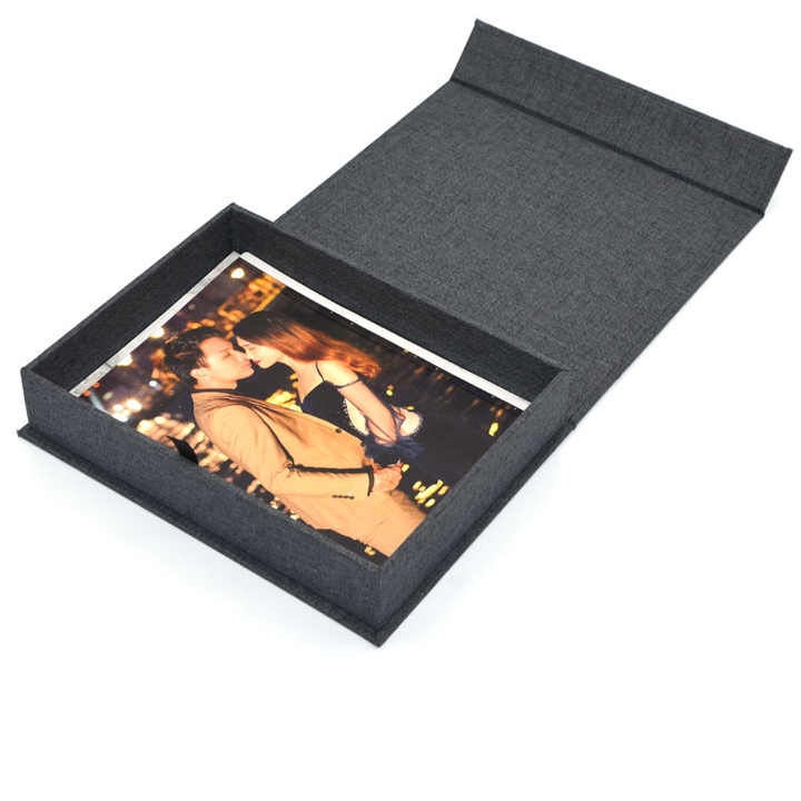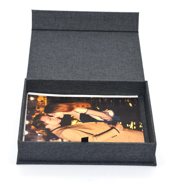 สีดำที่ทันสมัย A4กล่องนำเสนอขนาดใหญ่แม่เหล็กผ้าลินินแฟลชไดรฟ์อัลบั้มรูปแสดง Usb ช่างภาพของขวัญผู้จัดจำหน่ายทอง