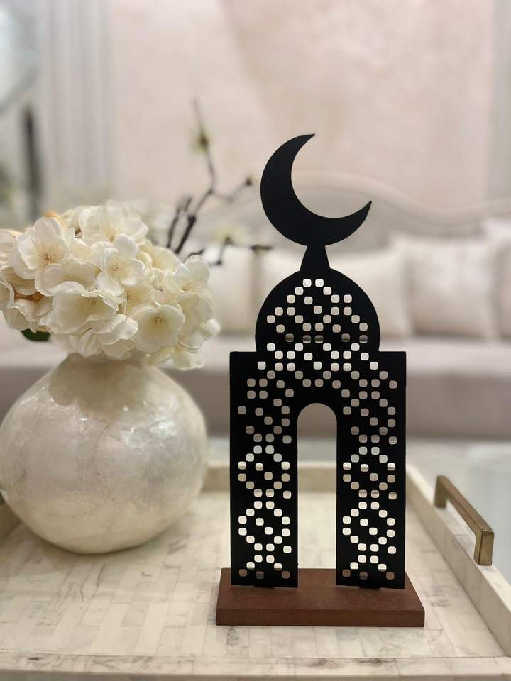 ชุดตกแต่งโต๊ะลายอักษรวิจิตรแบบรอมฎอนและซุ้มมัสยิดสีดำ พร้อมลวดลายดาวสำหรับตกแต่งบ้านในช่วงเทศกาล