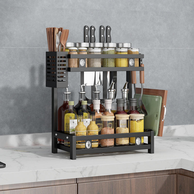ชั้นวางของในครัวแบบหลายชั้นสีดำ สำหรับจัดเก็บน้ำมัน เกลือ ซอส ซีอิ๊ว น้ำส้มสายชู มีด แบบตั้งพื้นทรงสี่เหลี่ยม เป็นมิตรกับสิ่งแวดล้อม