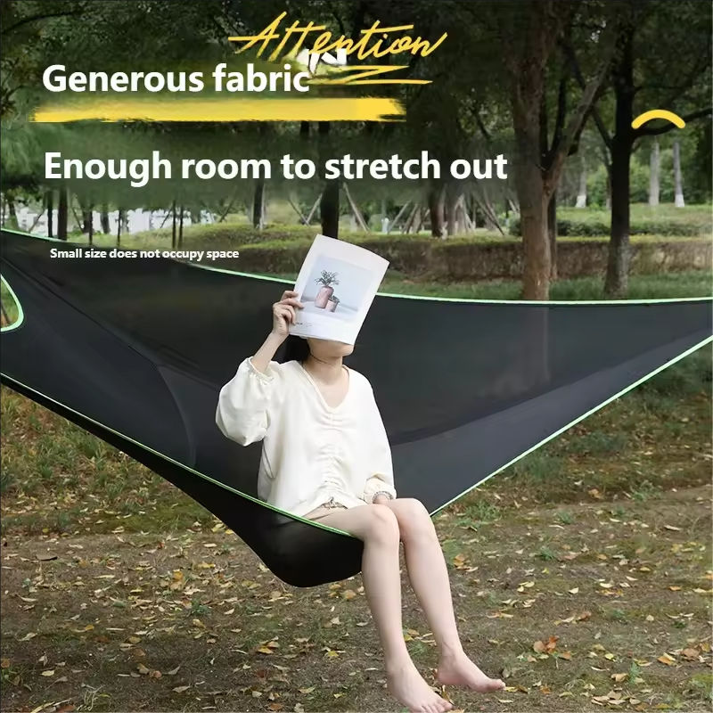 เปลญวนสามเหลี่ยมตาข่ายไนลอนสีดำ ระบายอากาศได้ดี สำหรับตั้งแคมป์ เดินป่า รองรับน้ำหนักได้ 2 คน 200 กก. ใช้ได้ทุกฤดู