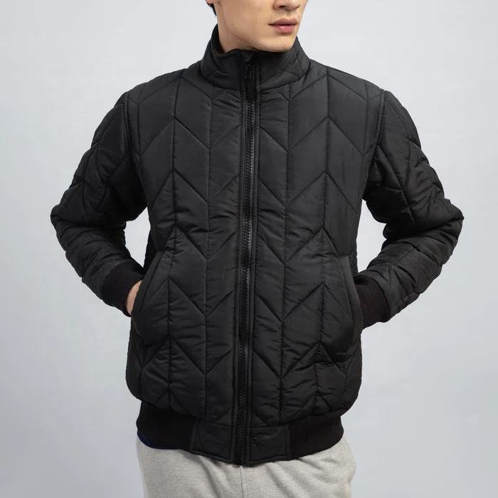 แจ็กเก็ตขนเป็ดบุผ้าไนลอนสีดำสำหรับผู้ชายกันน้ำมีซิปรูปซิกแซกตกแต่งโลโก้