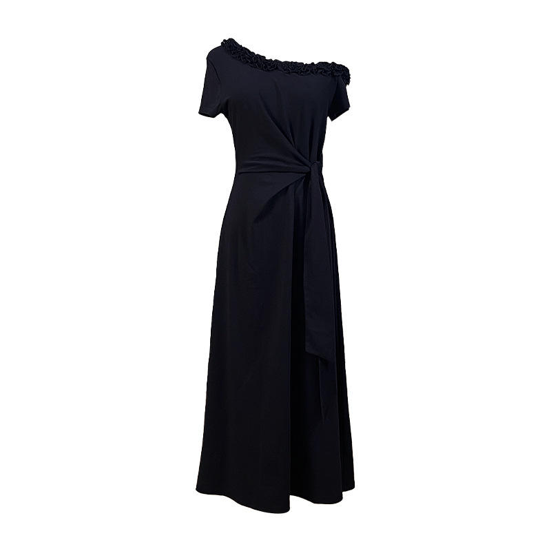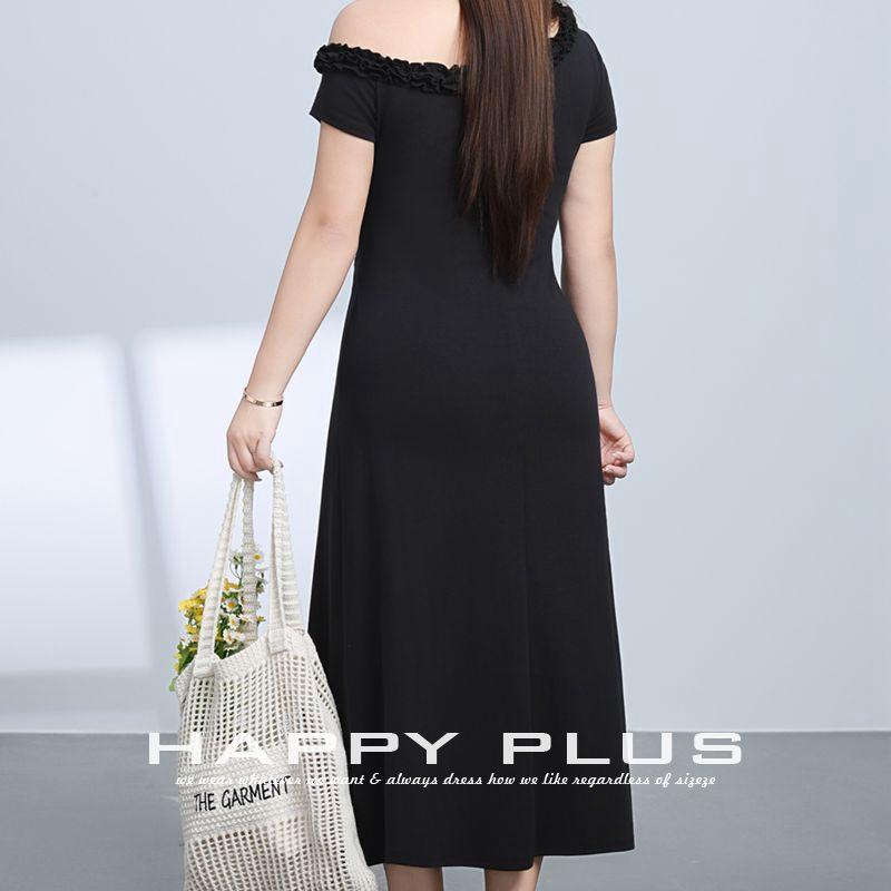 เดรสสีดำแบบเปิดไหล่แต่งระบาย ไซส์พลัส เอวธรรมชาติ สไตล์ลำลอง สำหรับผู้หญิง สีพื้น รุ่น N9256