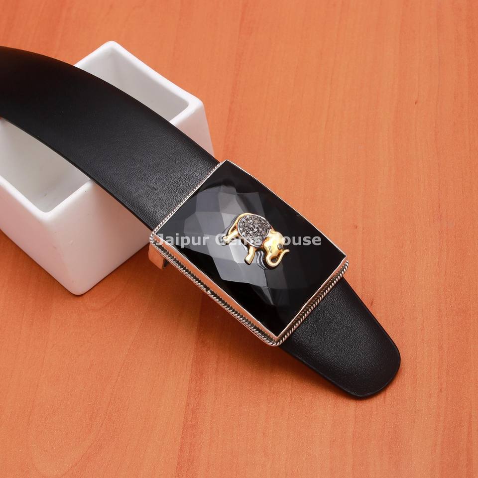 เครื่องประดับเงินแบบพรีเมี่ยมสำหรับผู้ชายหัวเข็มขัดโอนิกซ์สีดำรูปช้างสีทองประดับเพชรสีขาวเพชร December birthstone สี่เหลี่ยม