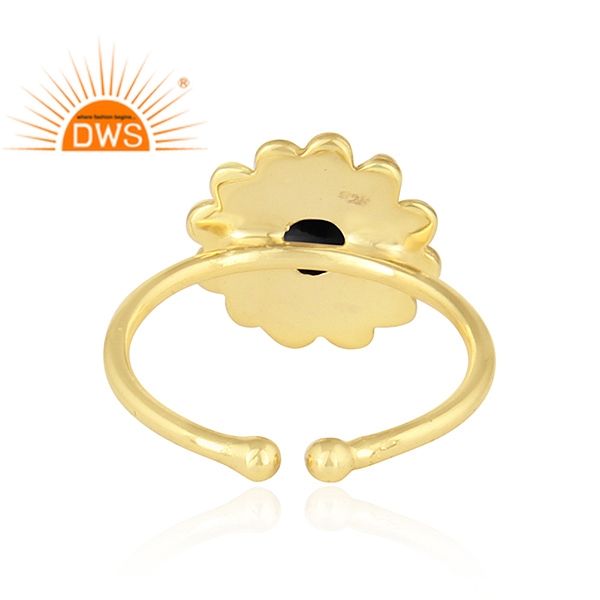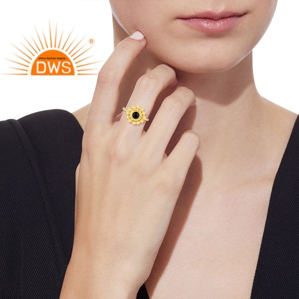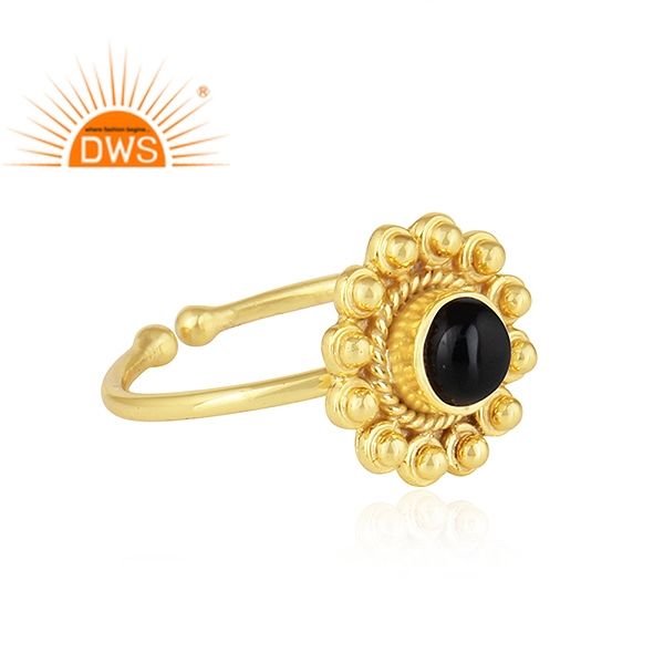 แหวนเงินแท้ 925 ชุบทอง ประดับพลอยแบล็คออนิกซ์ ดีไซน์ดอกไม้แบบชาติพันธุ์ ปรับขนาดได้