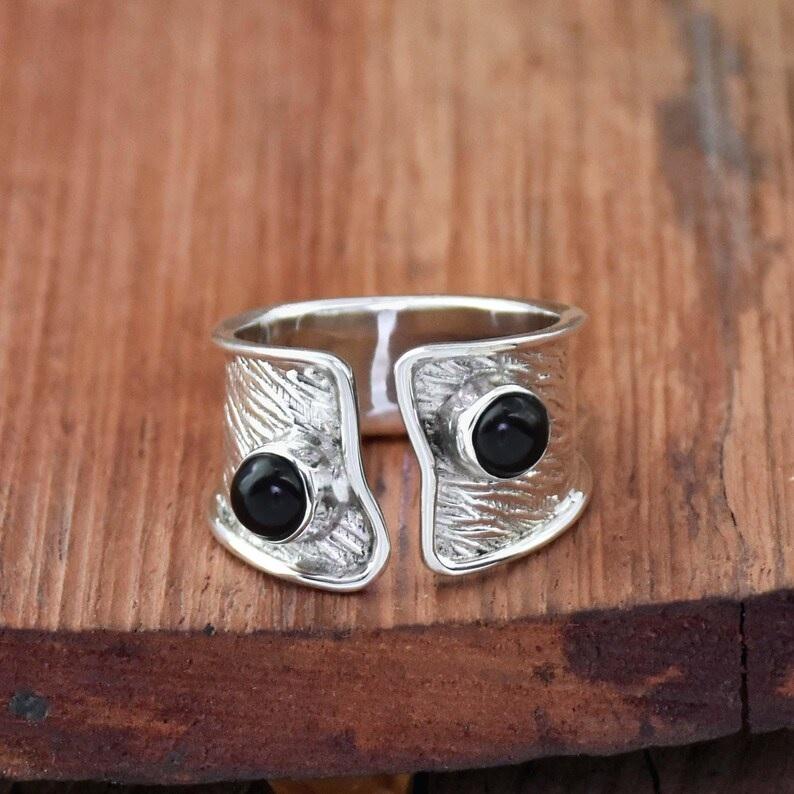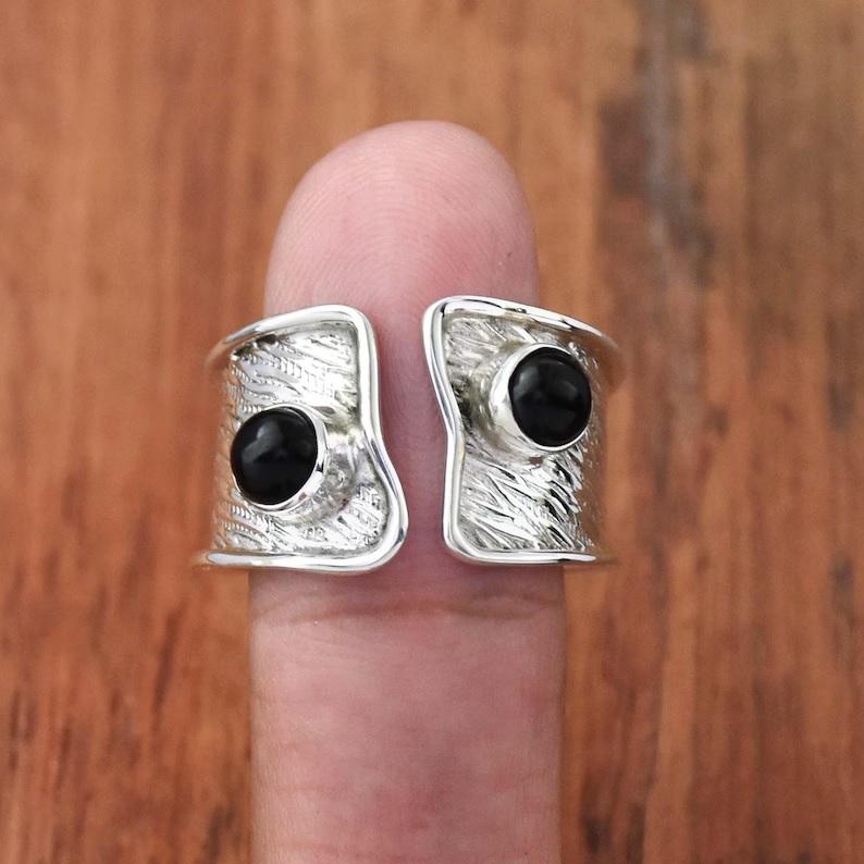 แหวนโอนิกซ์สีดำ925พลอยทรงกลมปรับได้พื้นผิวแหวนกว้างของขวัญสำหรับเธอ
