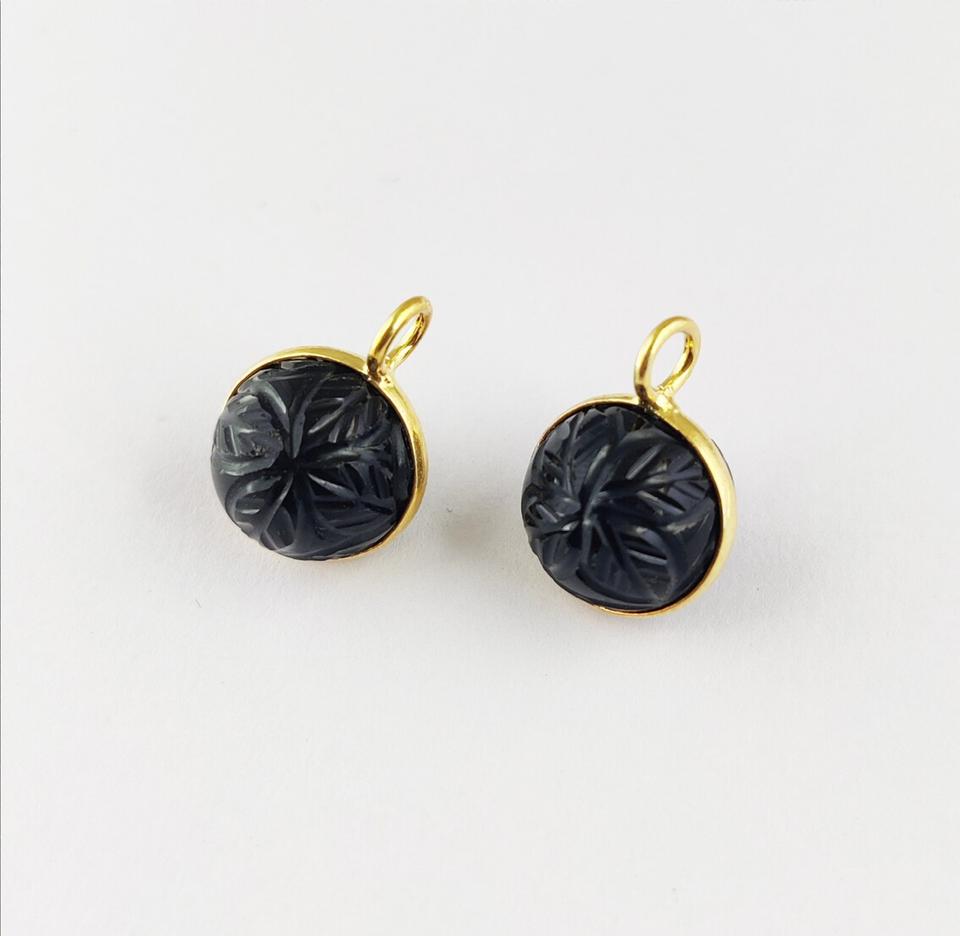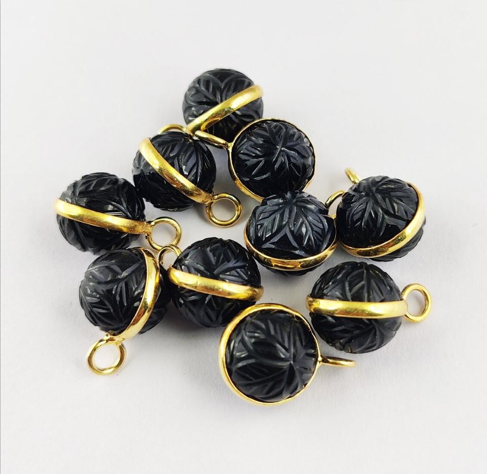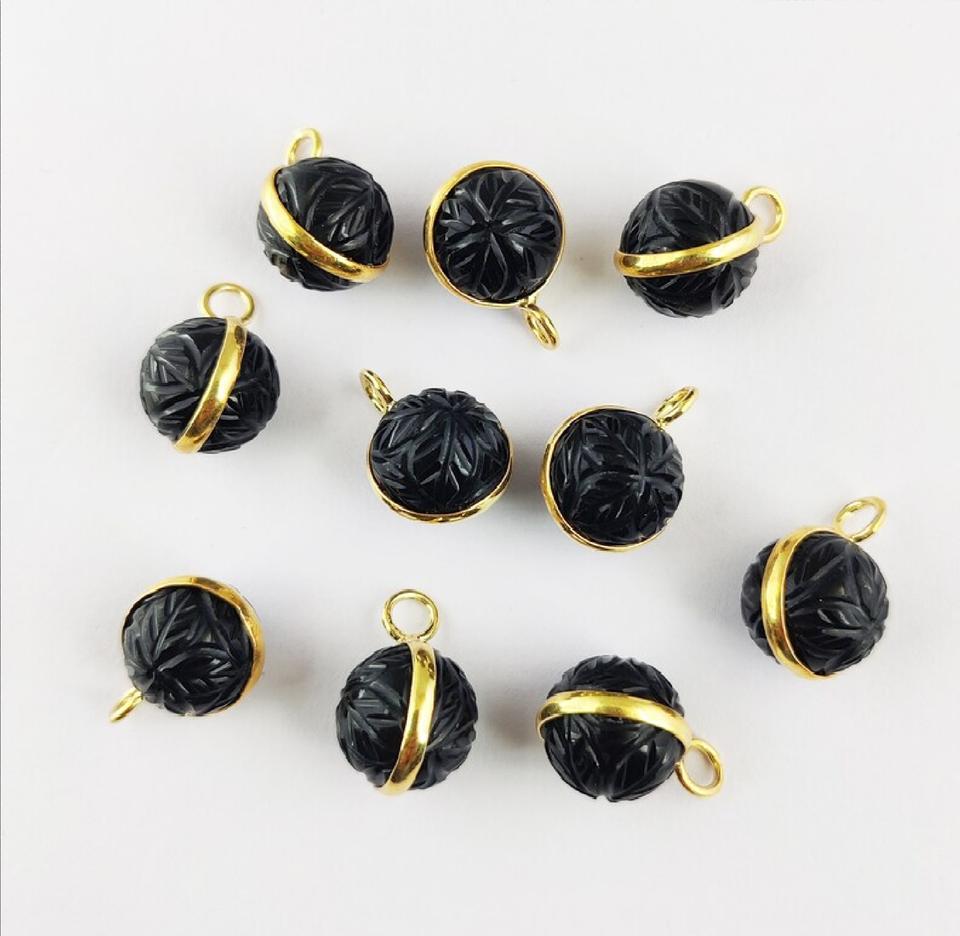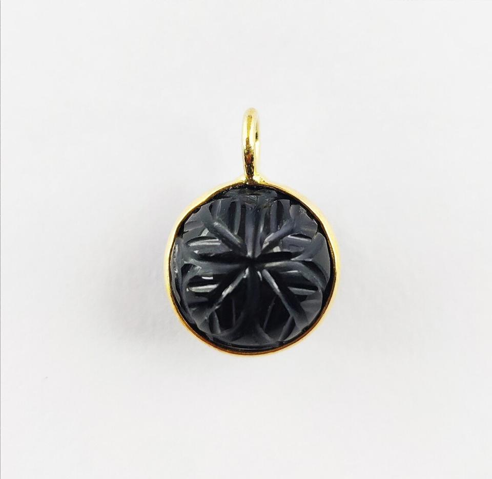 จี้หินออนิกซ์สีดำทรงกลมแกะสลัก ตัวเรือนเงินแท้ 925 ชุบทองคำแท้ ประดับด้วยจี้หินออนิกซ์สีดำแกะสลักด้วยมือ