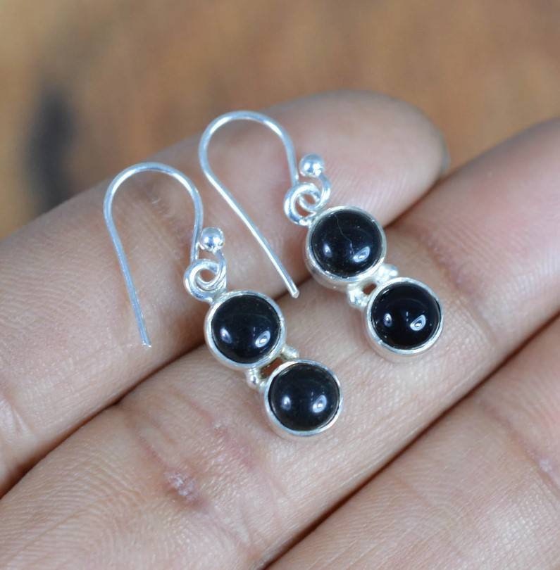 ต่างหูเงินสเตอริง925สำหรับเด็กผู้หญิงอัญมณีโอนิกซ์สีดำธรรมชาติแบบสองชั้นสีดำนิล