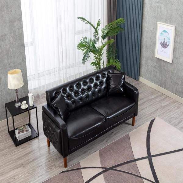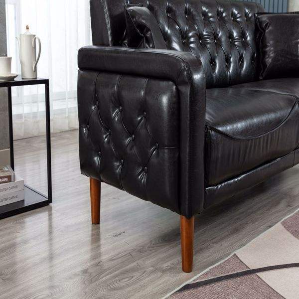 โซฟาฟองน้ำหนัง PU สีดำพร้อมเท้าไม้ที่ถอดออกได้และปุ่มกระจุกสำหรับห้องนั่งเล่น