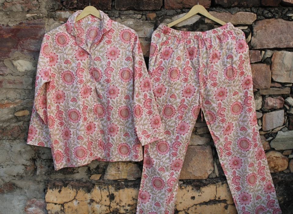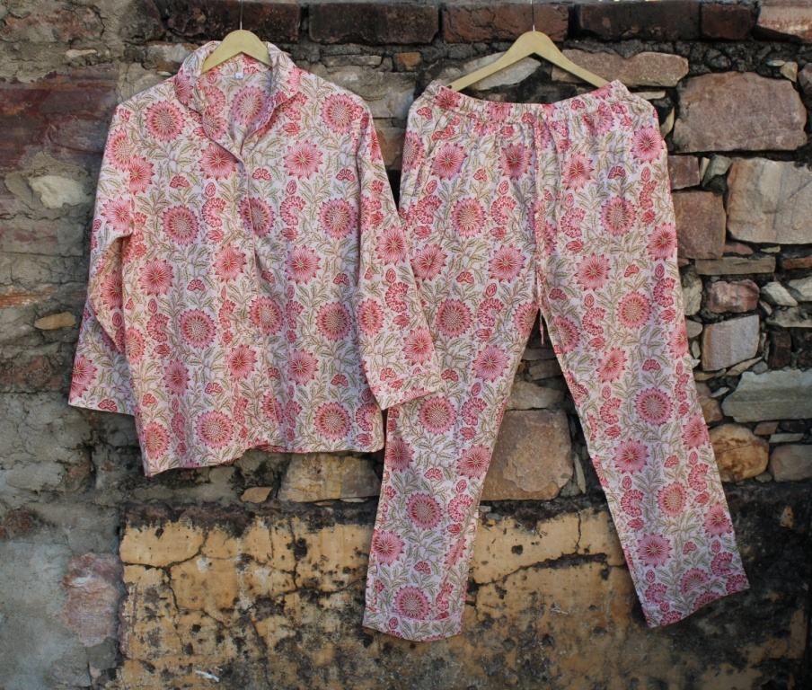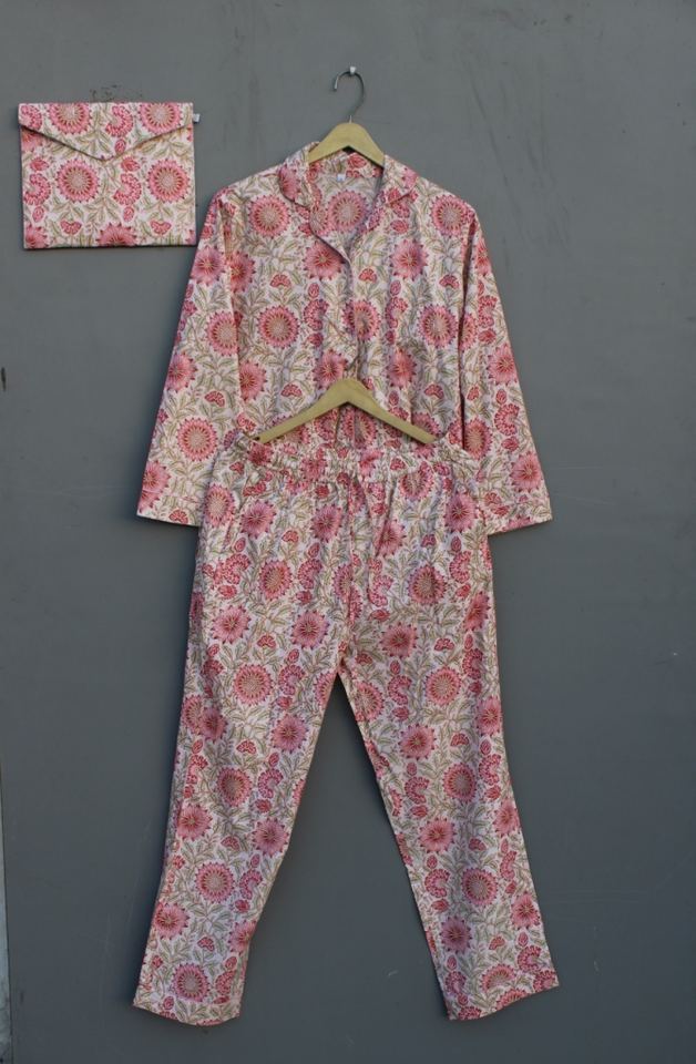 ชุดนอนผ้าฝ้ายแท้ 100% สีดำ ดีไซน์หรูหรา นุ่มสบาย ลายดอกไม้แบบอินเดีย พิมพ์ด้วยมือ แขนยาว เหมาะสำหรับฤดูใบไม้ผลิและฤดูร้อน