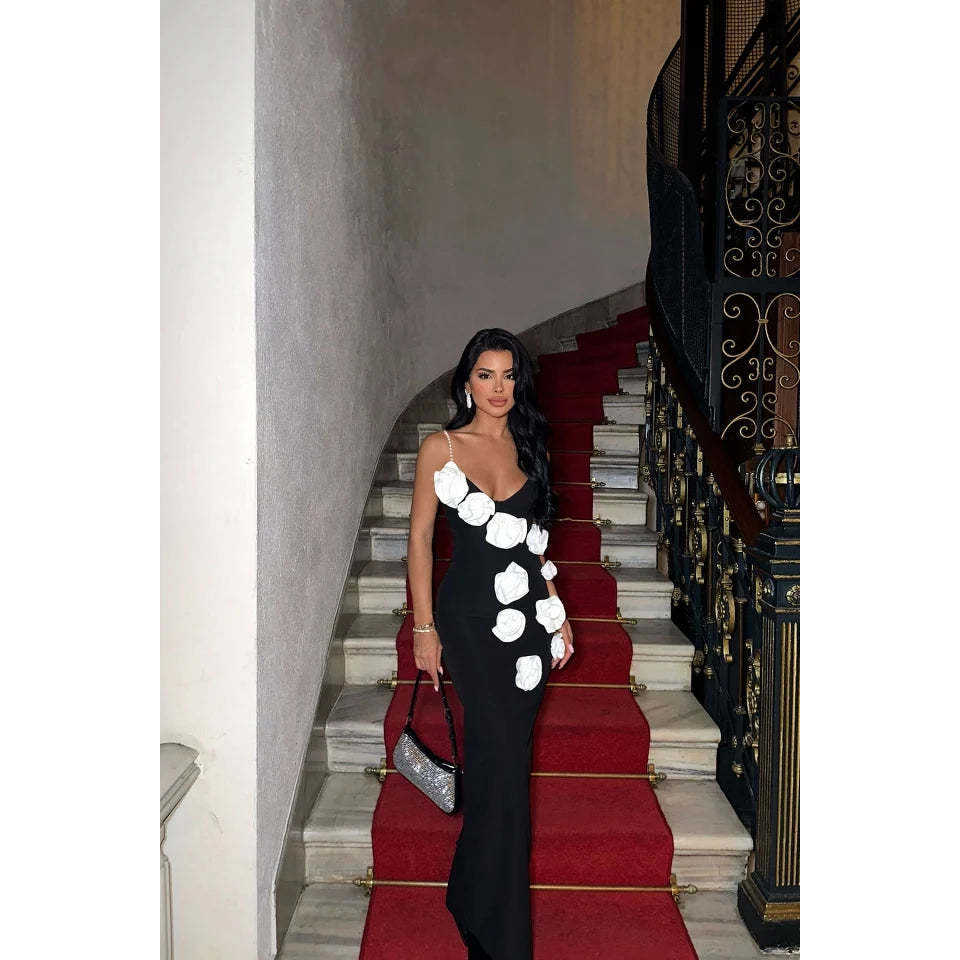 ชุดราตรีสีดำประดับมุก สายเดี่ยว แต่งดอกกุหลาบ แขนสั้น ยาวกรอมพื้น สำหรับงานเลี้ยงตอนเย็น