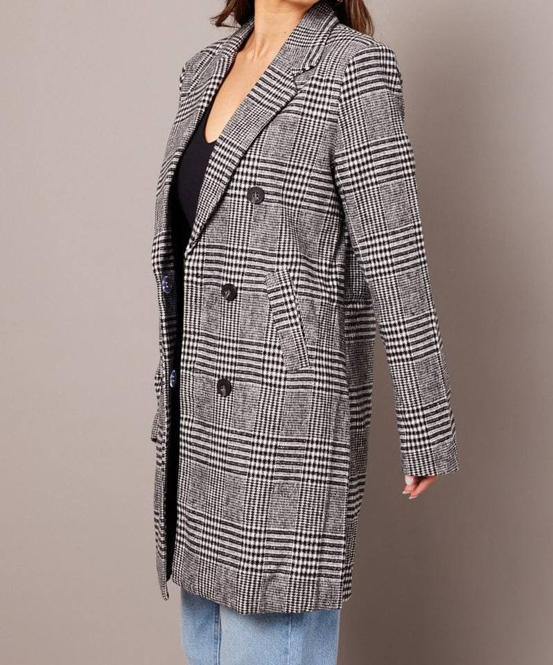 เสื้อโค้ทลำลองกันลมกันยับ แขนยาว ผ้าถักผสมขนสัตว์โพลีเอสเตอร์ ลายสก็อตสีดำ ติดกระดุมสองแถว