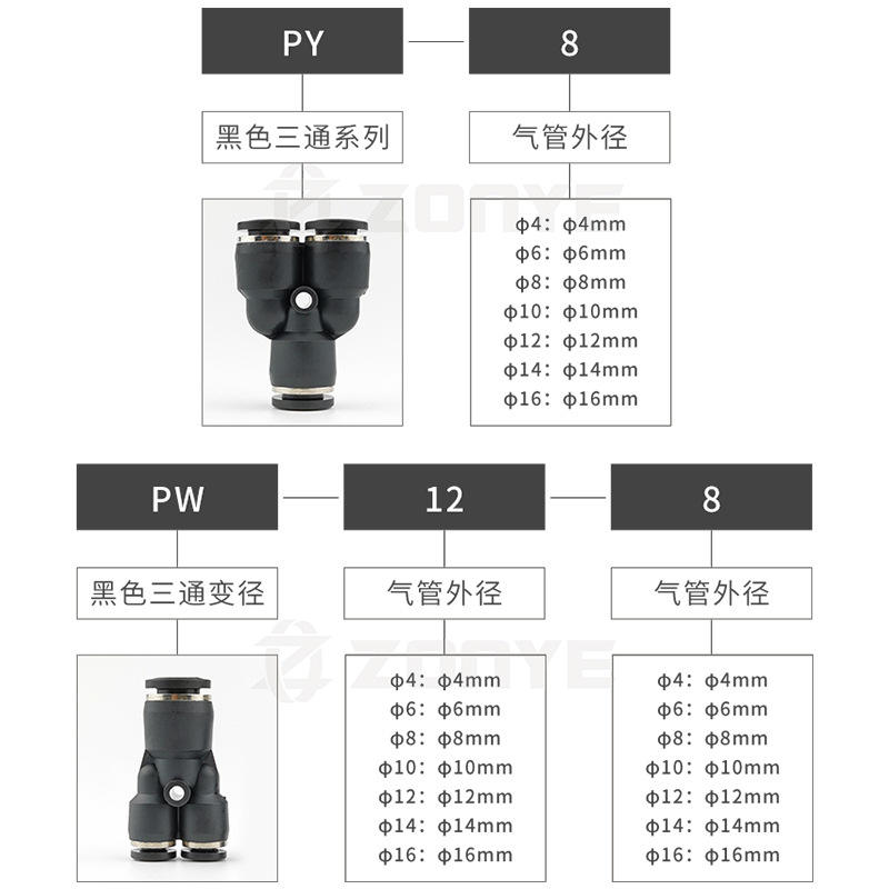 ข้อต่อลมแบบเร็ว PY8 สีดำ พลาสติก สำหรับสายลม ขนาด PW/6/10/12/14/16 แบบลดขนาด