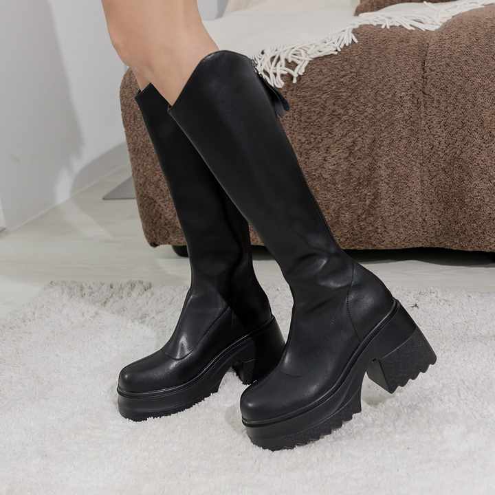 พื้นรองเท้าหนาสีดำรองเท้าบูทสูงถึงเข่าพื้นรองเท้าด้านนอกเป็นยางทนทาน