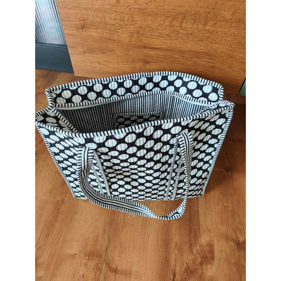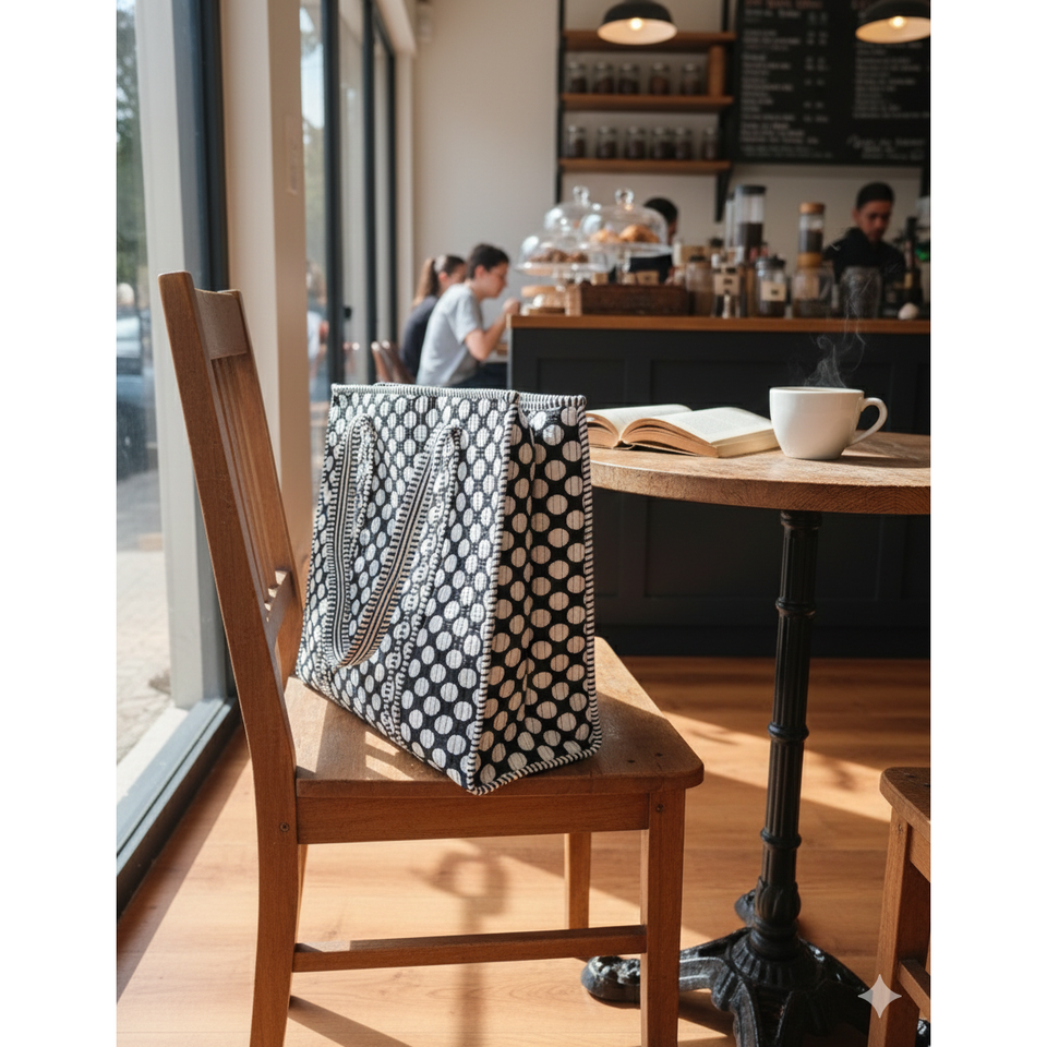 Black Polka Dot Recycled Cotton Tote Bag Zipper Eco-Friendly Recyclable Hand Length Handle Groceries Daily Use Medium Size