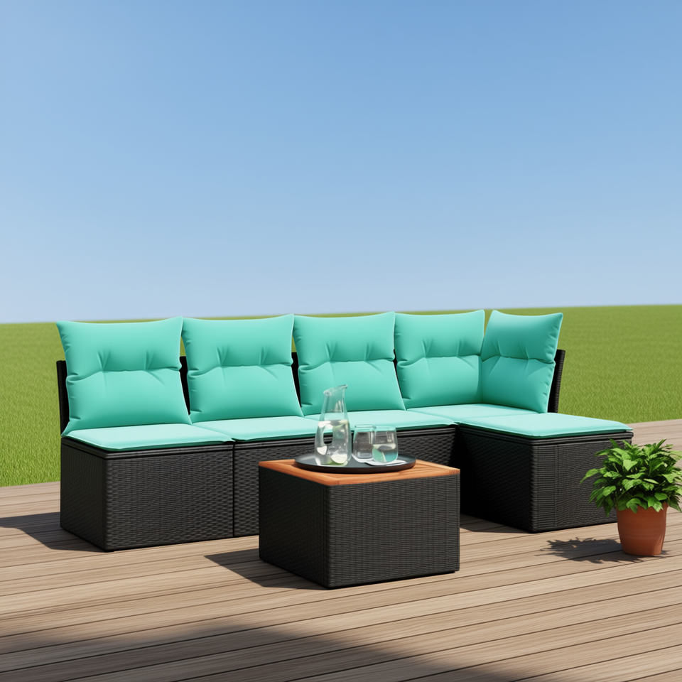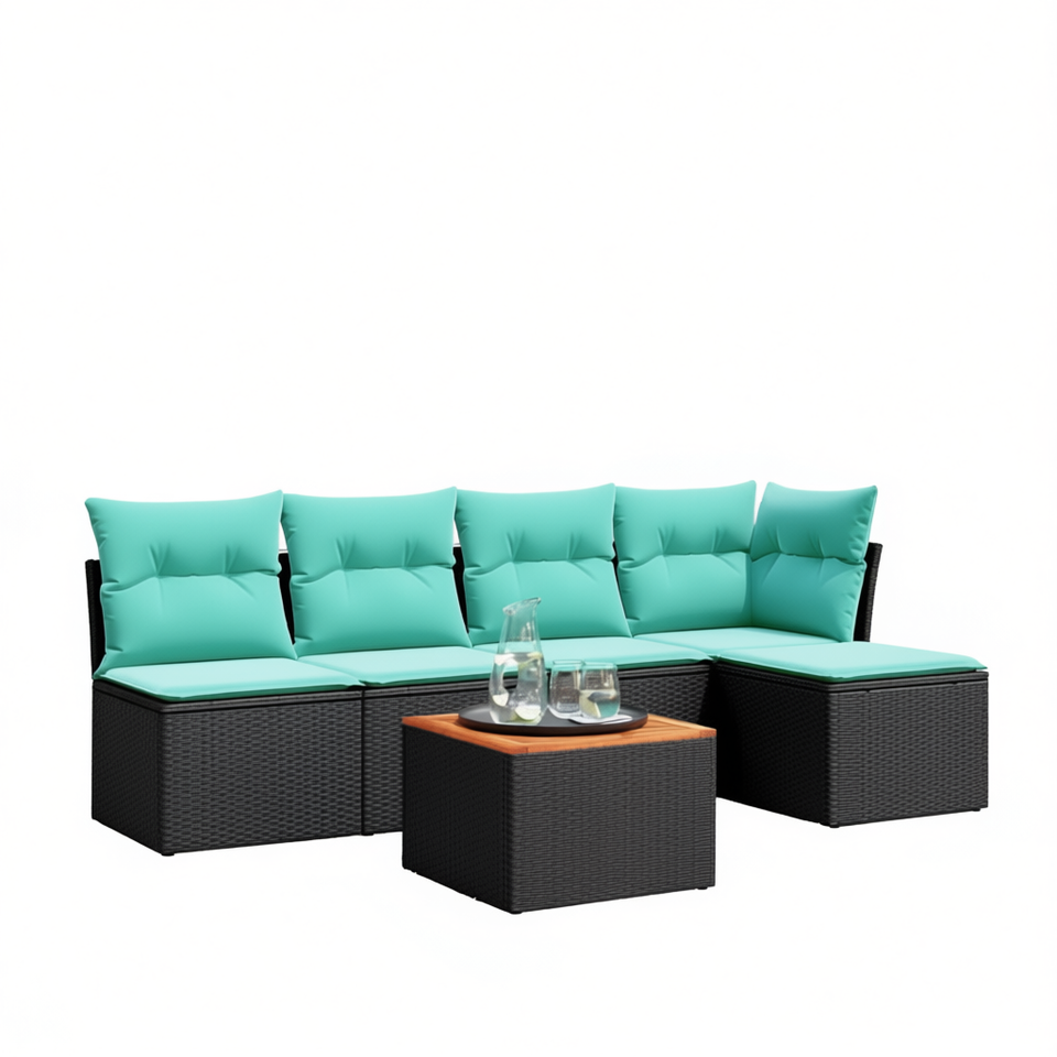 ชุดโซฟาหวายสังเคราะห์สีดำพร้อมเบาะรองนั่ง เฟอร์นิเจอร์กลางแจ้งสำหรับ 6 ที่นั่ง ดีไซน์ร่วมสมัย สไตล์โมเดิร์น