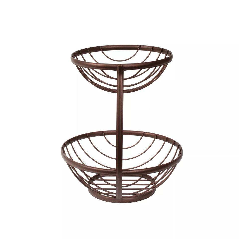 ตะกร้าผลไม้โลหะสองชั้นที่มีการออกแบบกรอบเปิดที่ทันสมัยเหมาะสำหรับการจัดเก็บเคาน์เตอร์ห้องครัวและการจัดระเบียบบ้านที่ทันสมัย