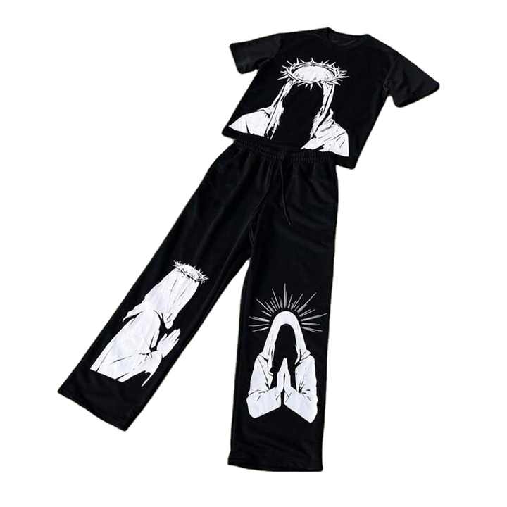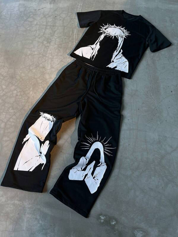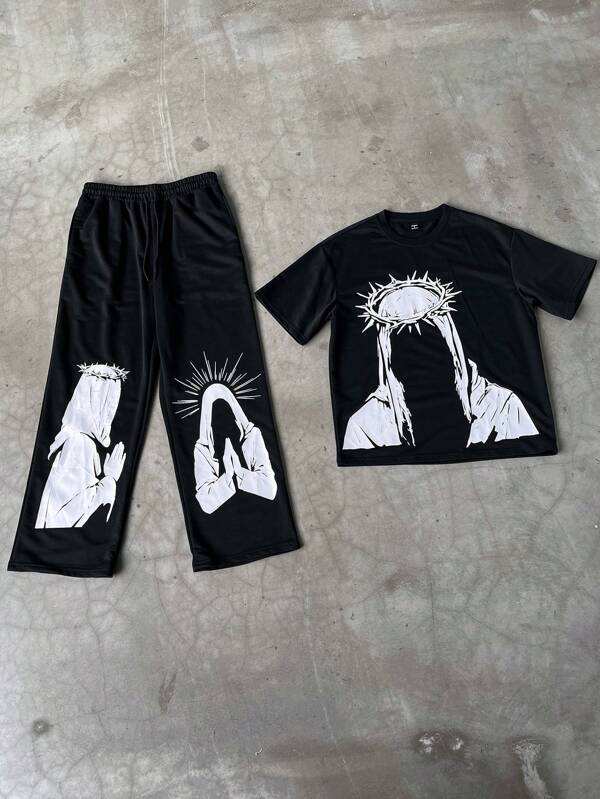 ชุดวอร์มพิมพ์ลายแบบพระเยซูเสื้อยืดและกางเกงขากว้างพร้อมเชือกรัดเอวสำหรับผู้ชายชุดวอร์มลายกราฟฟิกแบบออกแบบได้ตามต้องการสีดำ