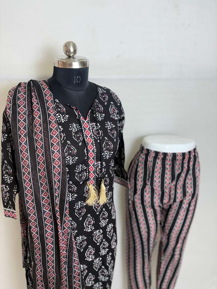 ชุดพิมพ์ลายผ้าฝ้ายสีดำพร้อม dupatta และกางเกงลายทาง