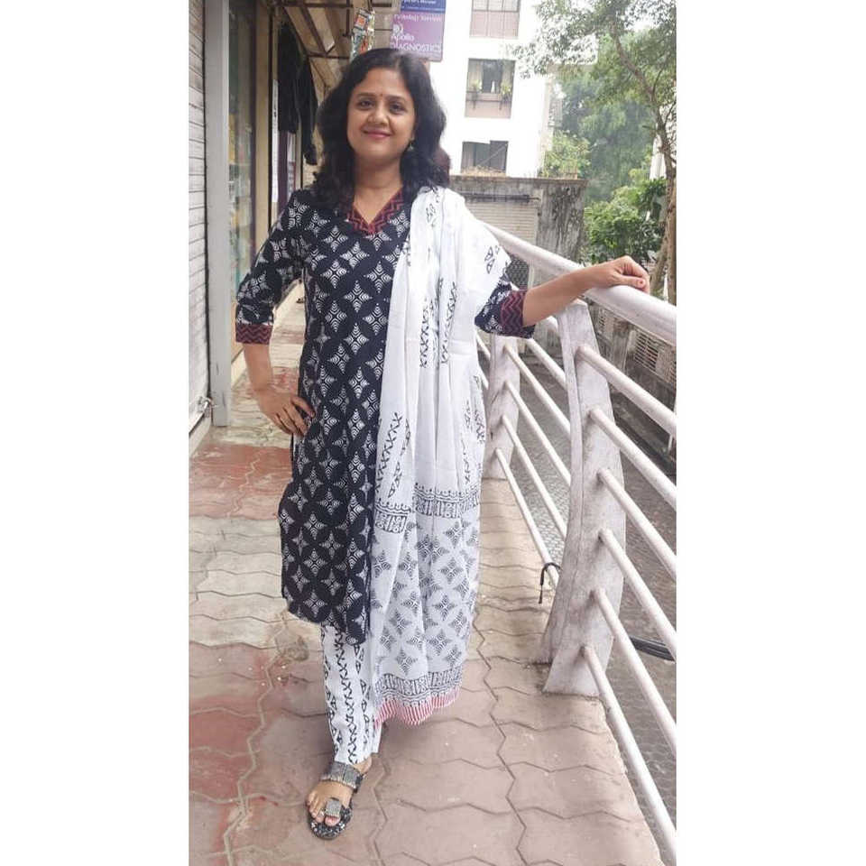 ชุดผ้าฝ้ายพิมพ์ลายบล็อกด้วยมือสีดำล้วนพร้อม dupatta