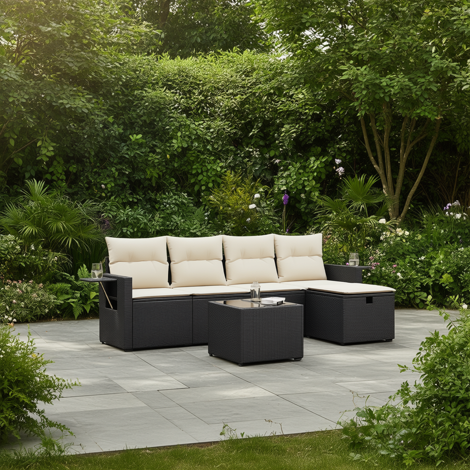 ชุดโซฟาหวายสีดำสำหรับสวน พร้อมเบาะสีครีม เฟอร์นิเจอร์กลางแจ้งกันน้ำ ดีไซน์ร่วมสมัย