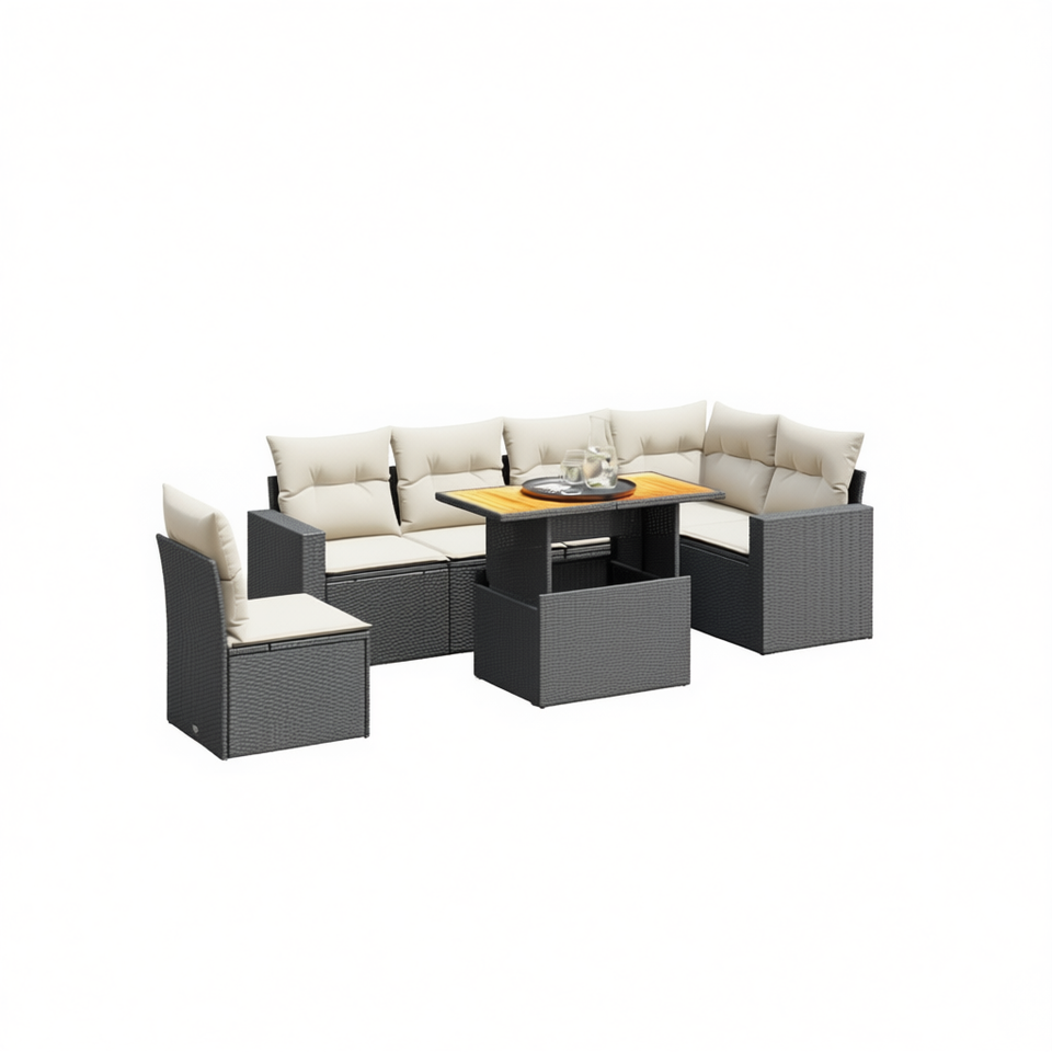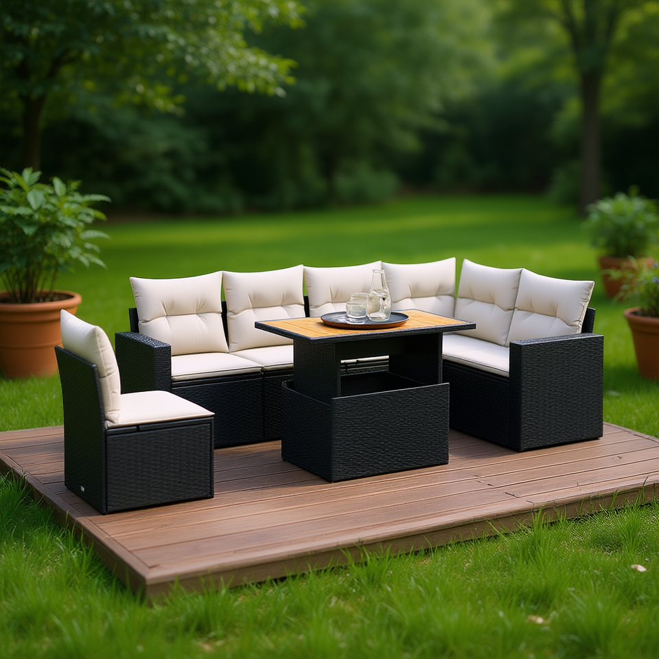 ชุดโซฟาหวายสีดำสำหรับสวน พร้อมเบาะโฟมความหนาแน่นสูง เฟอร์นิเจอร์กลางแจ้ง ดีไซน์ร่วมสมัย กันน้ำ ทนรังสียูวี ผลิตจากพลาสติก PE