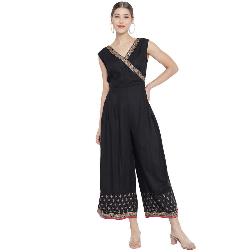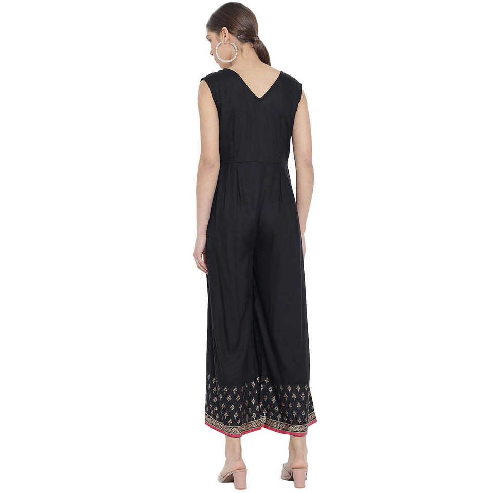ชุดจั๊มสูทผ้าเรยอนสำหรับผู้หญิงพิมพ์ลายดอกไม้ผ้าเรยอนสีดำทรงหลวมเอวสูงชุดเดรสชายหาดฤดูร้อนแบบสั่งตัดตามแบบได้