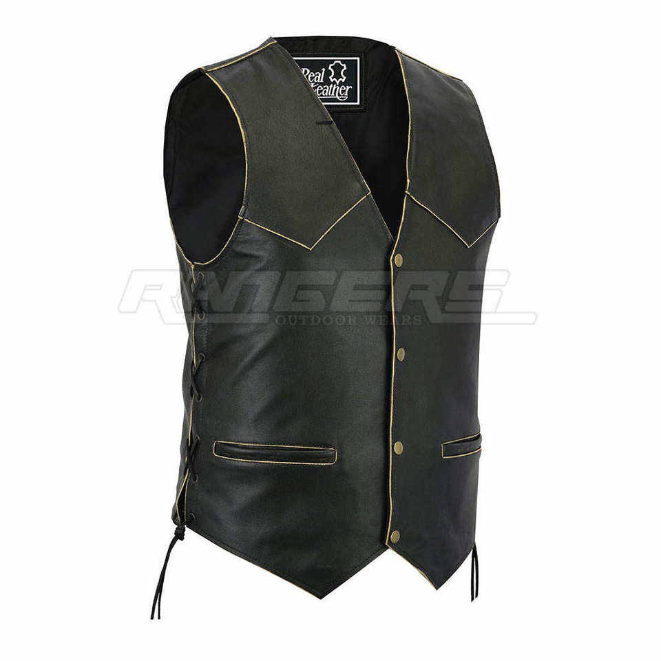 เสื้อกั๊กหนังแท้สีดำสำหรับขี่มอเตอร์ไซค์ แบบผูกเชือกด้านข้าง ปรับขนาดได้ เสื้อกั๊กหนังสั่งทำขายส่ง เสื้อแจ็คเก็ตไร้แขนสำหรับนักขี่มอเตอร์ไซค์