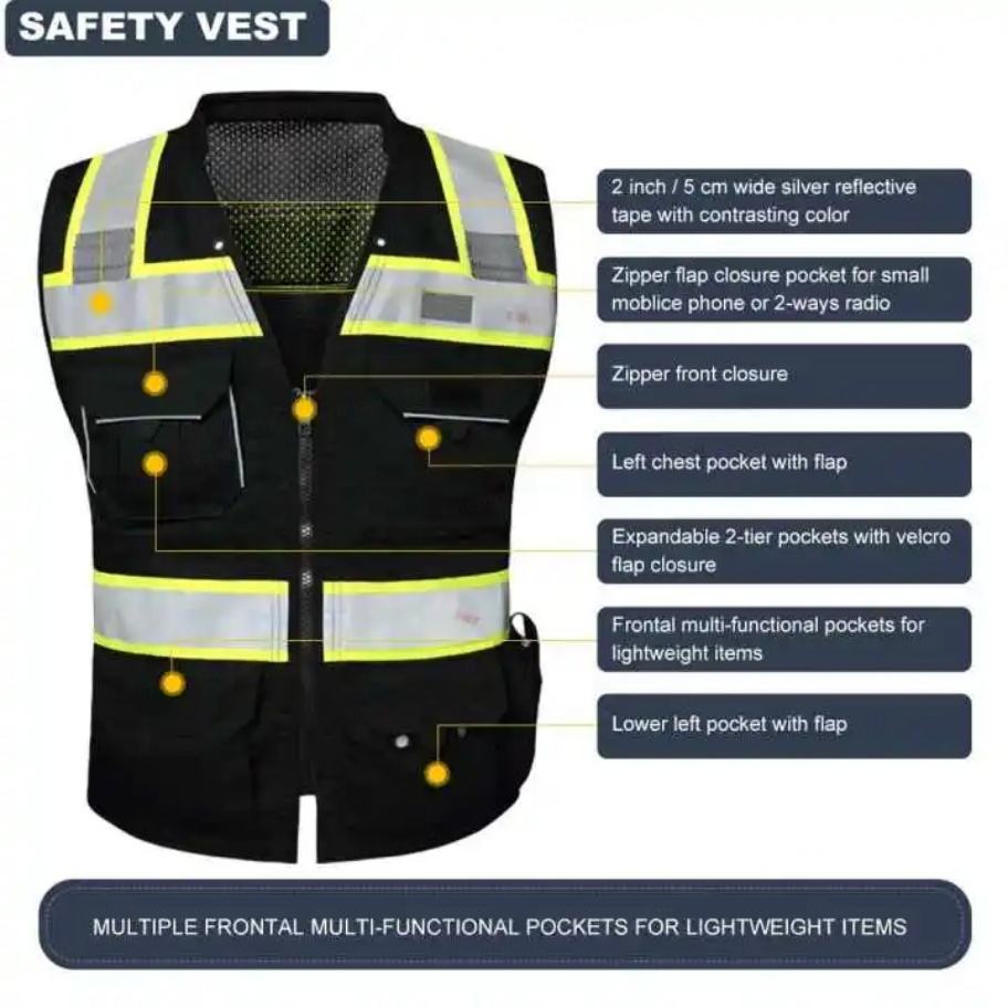 เสื้อกั๊กนิรภัยสะท้อนแสงสีดำ ปรับได้ มีกระเป๋า สีตามสั่ง สะท้อนแสงได้ดี มาตรฐาน ANSI Class 1 ผลิตจากโพลีเอสเตอร์ 100%