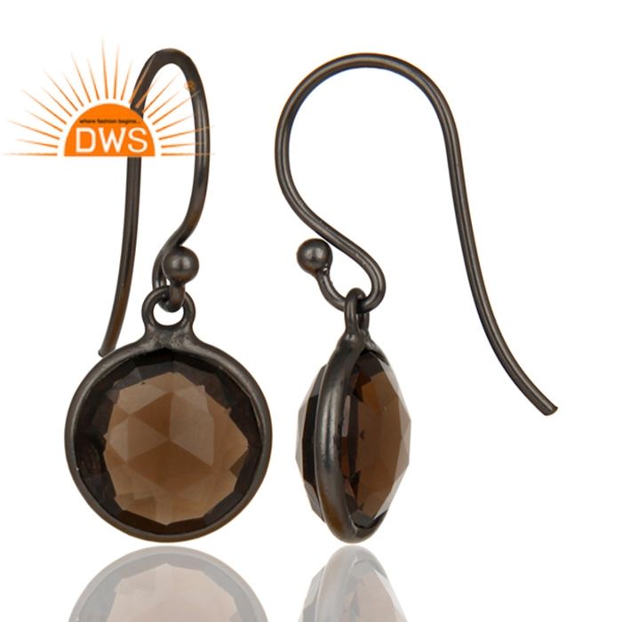 โรเดียมสีดำ925ต่างหูเงินผู้ผลิตเครื่องประดับรอบ Smoky ควอตซ์ชุด Bezel หยดต่างหูเครื่องประดับผู้ผลิต