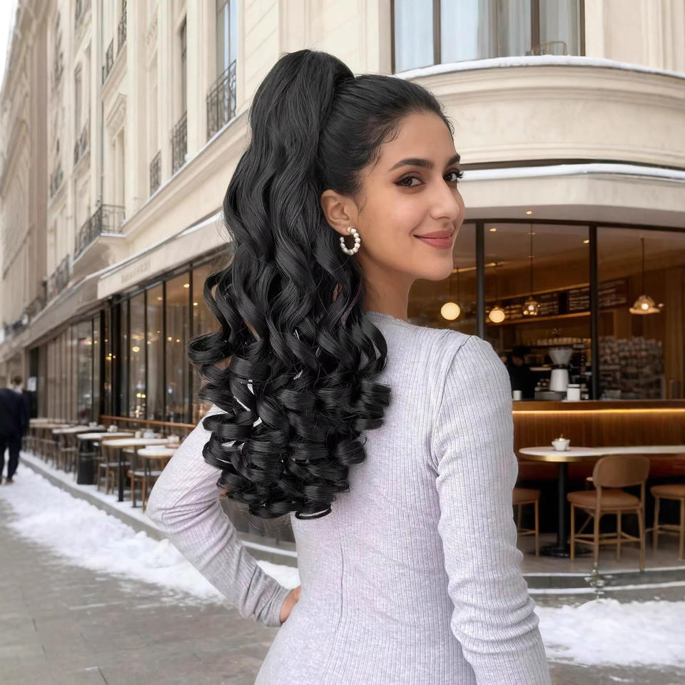 ผมต่อหางม้าสีดำแบบโรมันเคิร์ล วัสดุใยสังเคราะห์ สี 1B ทนความร้อนสูง แบบหนีบ ยี่ห้อเหอหนาน รุ่น PY706 10